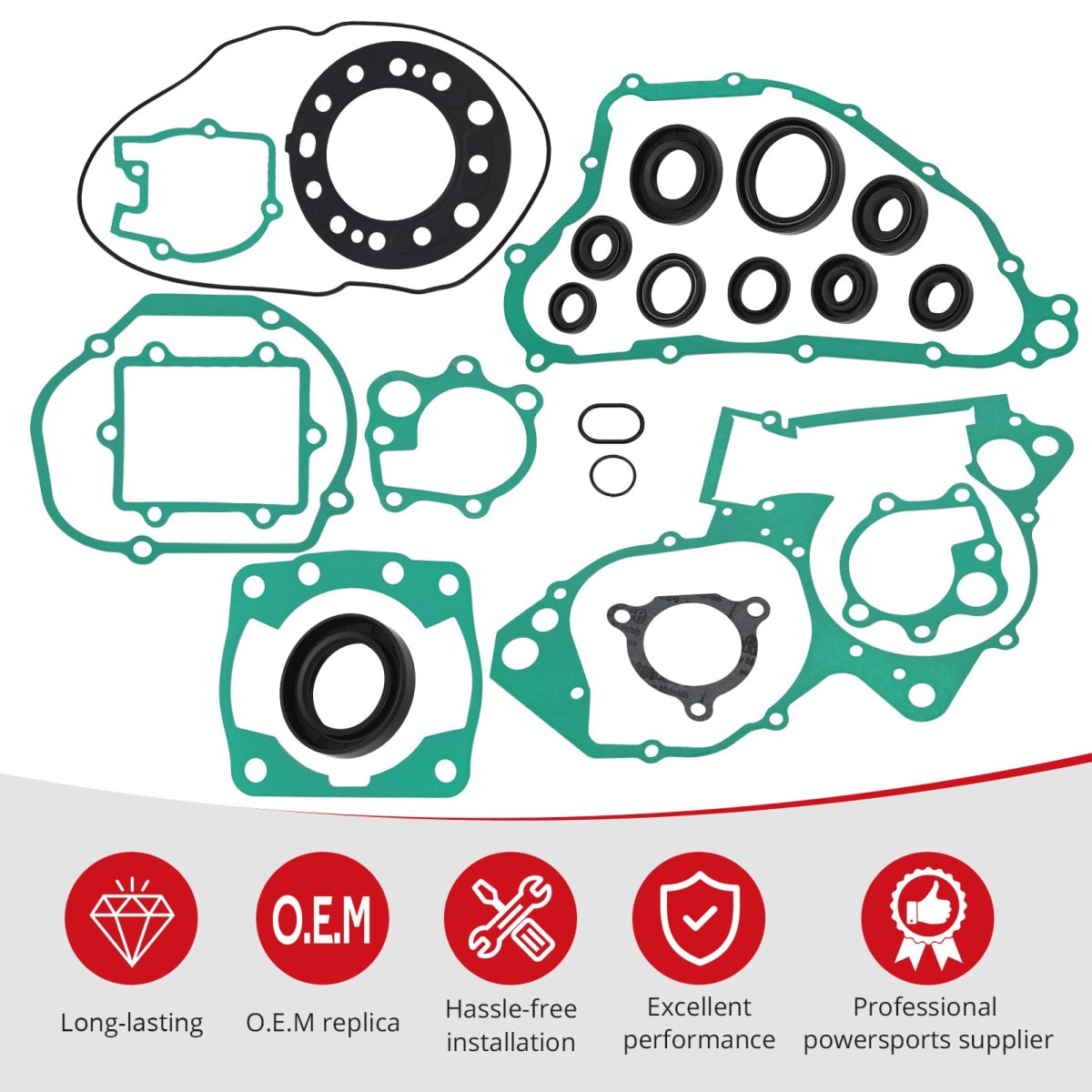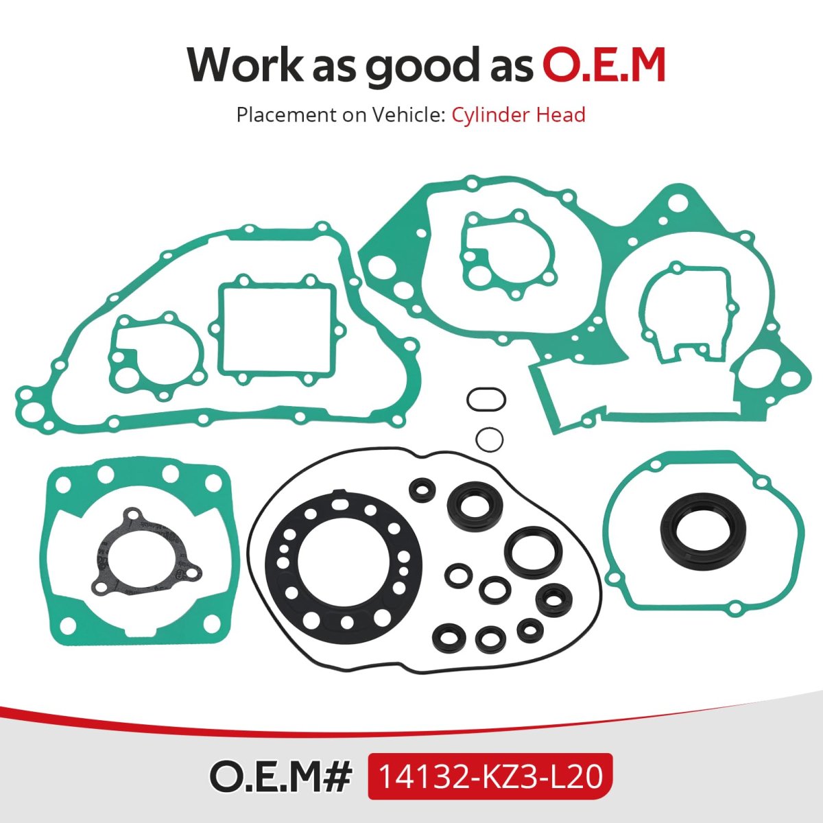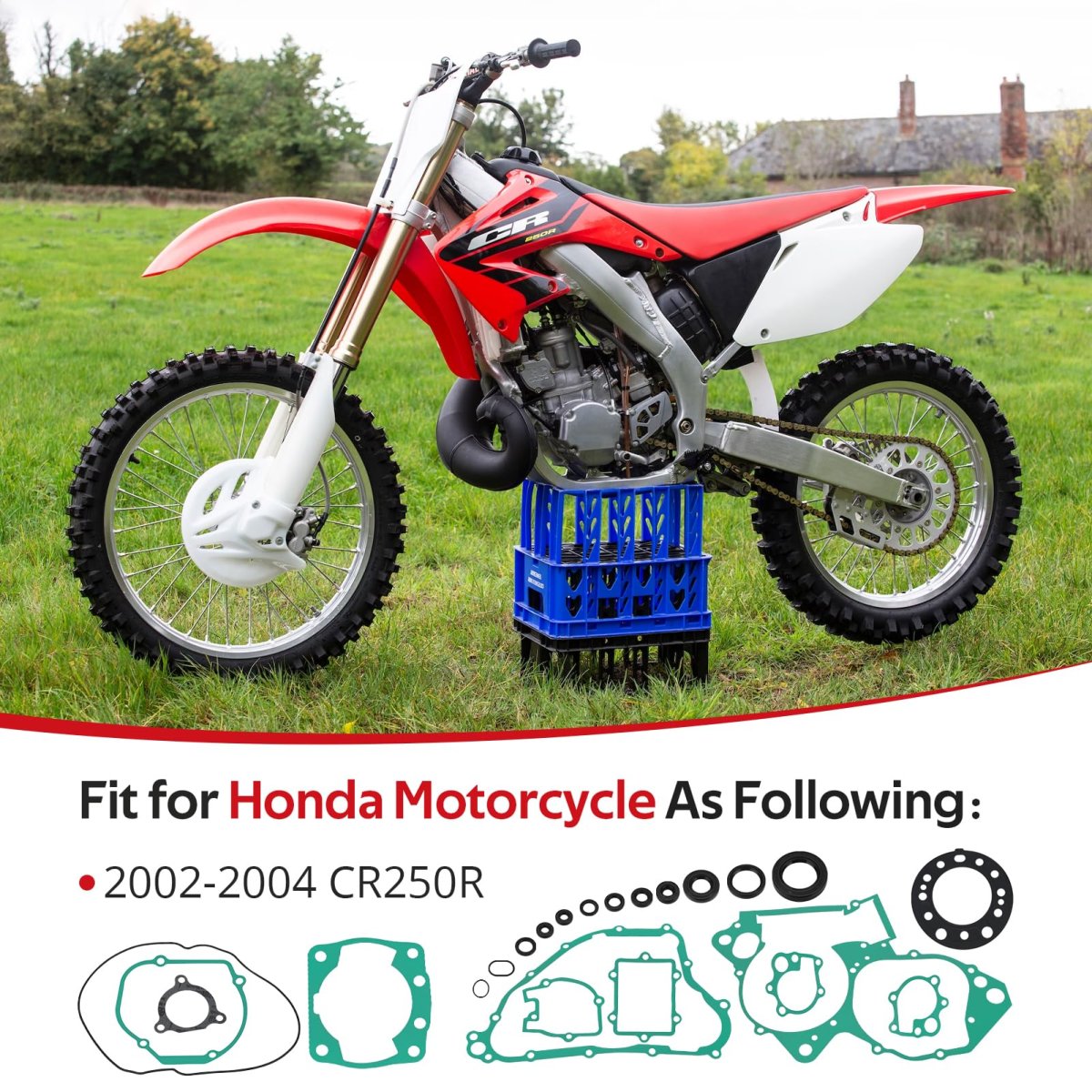 Fitment: Fit For Honda Motorcycle As Following: 2002-2004 CR250R. Feature: Well made and factory specification. Everything was included to install on the cylinder head but except instruction. NOTE: The gasket do not fixed too tight and not too loose. Any of these two conditions can ruin the gasket's efficiency. O.E.M# 14132-KZ3-L20. Package: Reed Valve Gasket x1; Crankcase Cover Gasket x1; Clutch Cover Gasket x1; Left Cover Seal Gasket x1; Stator Cover Gasket x1; Cylinder Head Gasket x1; Cylinder Base Gasket x1; Exhaust Gasket x1; Water Pump Cover Gasket x1; Clutch Cover O-Ring x1; Oil Seal (12X18X3) x1; Oil Seal (20X37X7) x1; Oil Seal (31X40X7) x1; Oil Seal (38X58X11) x1; Oil Seal (14X22X5) x1; Water Pump Seal (12x25x7mm) x1; Oil Seal (20x28x5mm) x1; Water Pump Seal (12x22x5mm) x1; O-Ring (37.2X27) x1.Other fine products