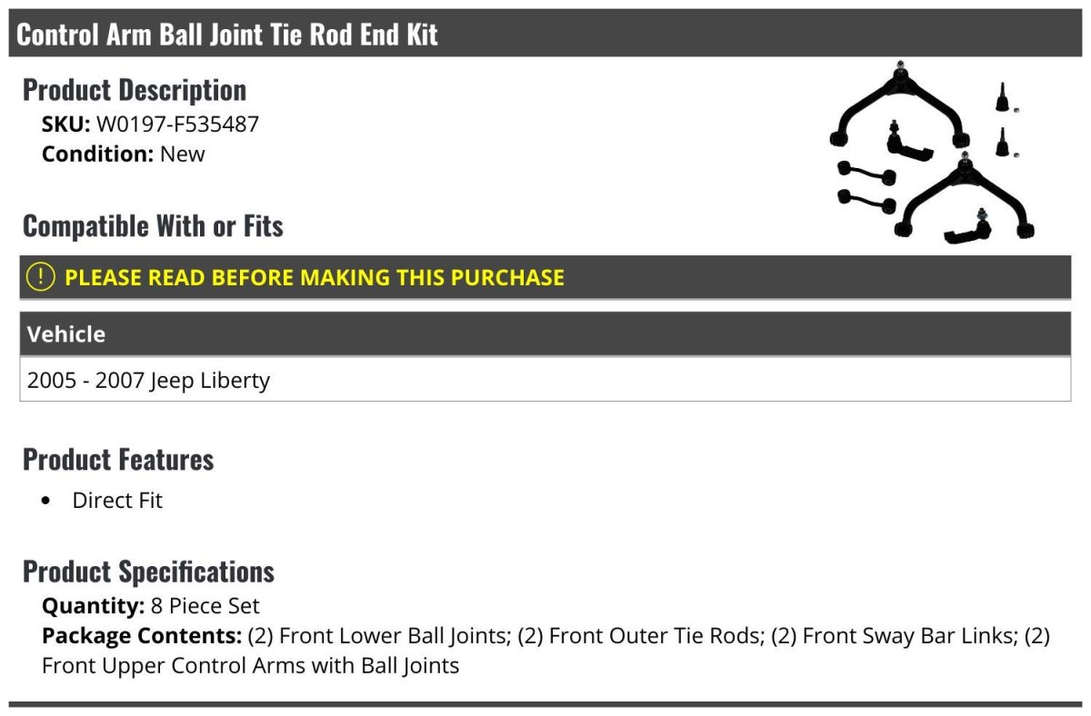 Compatible with or fits: 2005 - 2007 Jeep Liberty. Direct Fit. Quantity: 8 Piece Set; Package Contents: (2) Front Lower Ball Joints; (2) Front Outer Tie Rods; (2) Front Sway Bar Links; (2) Front Upper Control Arms with Ball Joints. Control Arm Ball Joint Tie Rod End Kit. Review Description to Ensure Proper Fit.Other fine products