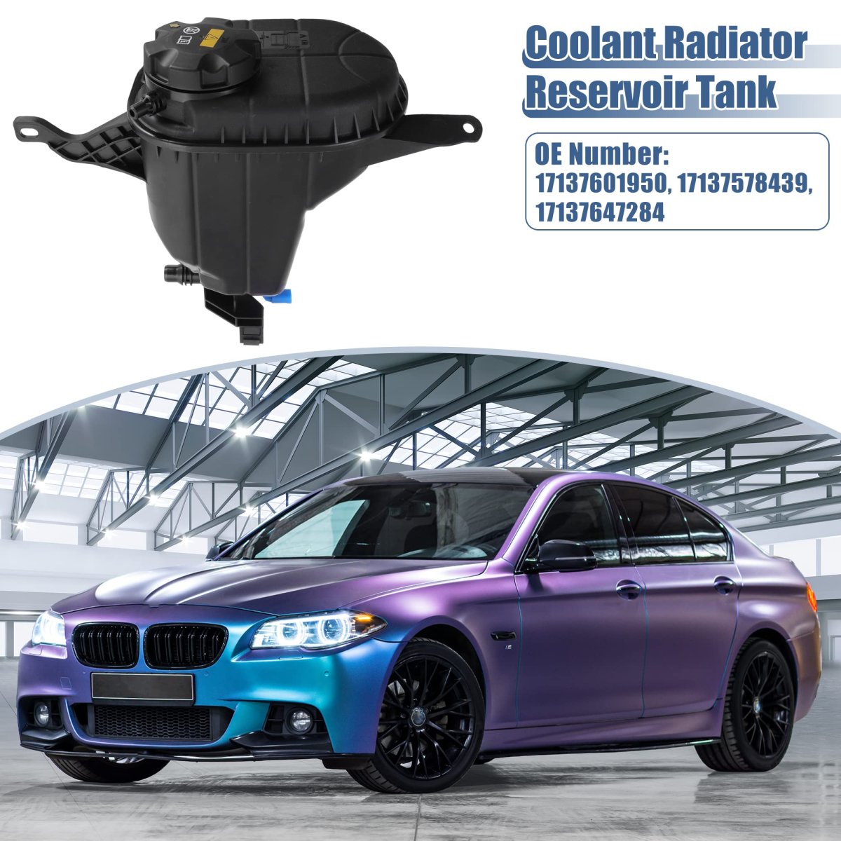 Part Number:17137601950, 17137578439, 17137647284, With Cap and Sensor.. Fitment: for BMW F10 528i 2011.. Function:Replace the coolant radiator reservoir tank to keep your engine at the right temperature under a variety of conditions and fix the problem of engine stall due to engine overheating.. Installation Instruction: Turn off and cool down the car, remove the bolts and the reservoir, allow the remaining coolant to flow back into the drain pan, replace the new reservoir tank and reinstall the coolant hose to the radiator and tighten the clamp, finally check if function well.. Durable Material:Using durable material construction aims to prolong service life, anti rust, anti oxidation, anti fluid loss, and anti deformation, and it will not fall off after prolonged use..Other fine products