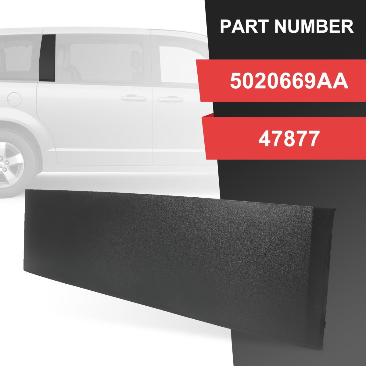 C pillar door window trim Fit for:replacement for Chrysler Town & Country 2008-2016,replacement for Chrysler Voyager 2008-2020,replacement for Dodge Grand Caravan 2008-2020.. Part number5020669AA 47877. Fit Position: Driver Side Rearward Door.Color:Gloss Black.. Reduce noise and prevent water leakage: Made of high grade ABS plastic and rubber,the surface is painted black,and the paint is not easy to peel off. The columnar decoration improves the windshield seal,prevents water leakage and reduces wind noise on the highway.. Fashionable design: The black C-pillar trim cover features a smooth and stylish design, with an exterior contour that matches the lines of your vehicle, effectively enhancing the overall appearance of your vehicle..Other fine products