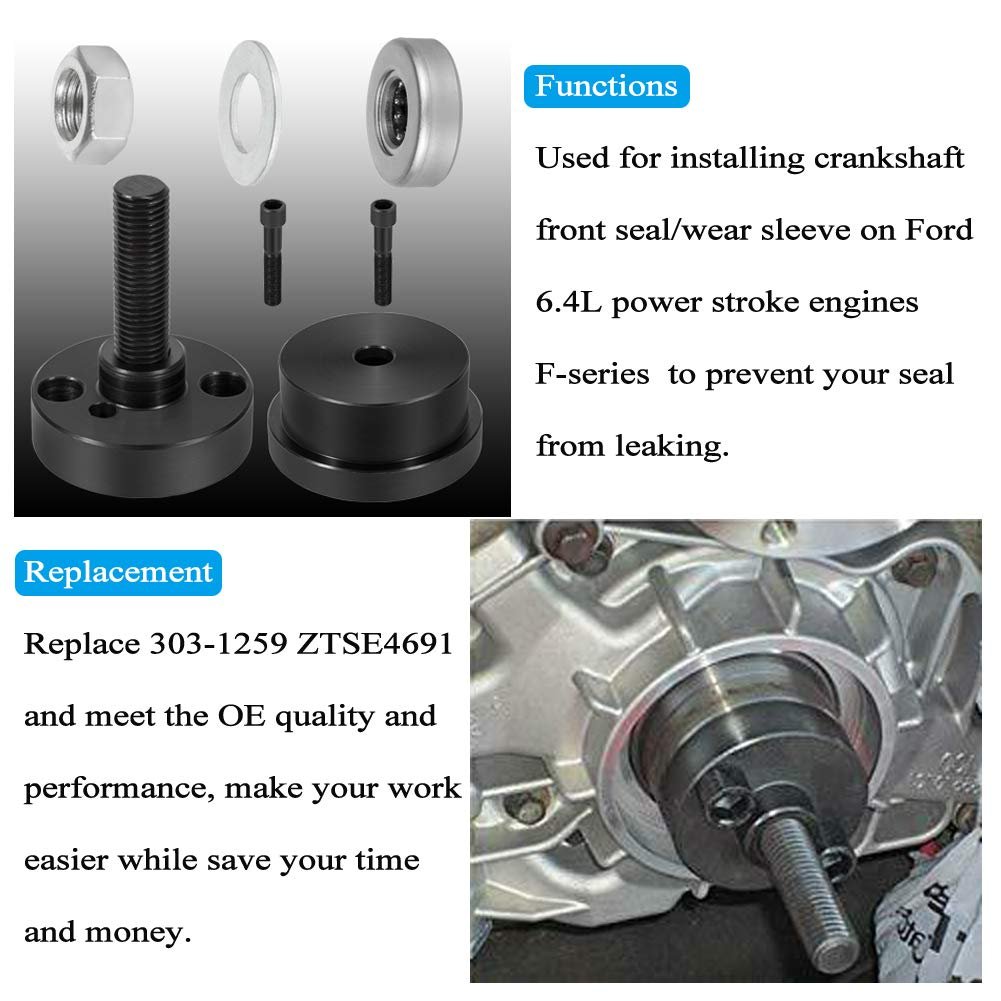 MaterialMade from quality carbon steel with great strength, corrosion resistance, anti-rust, impact resistance, wear resistance and durable.. ApplicationsSuitable for Ford 6.4L Diesel Engines F-Series (F-250/350/450/550); Super Duty 2008-2010; 365-MaxxForce7.. FunctionsUsed for installing crankshaft front seal/wear sleeve for Ford 6.4L power stroke engines F-series to prevent your seal from leaking.. ReplacementReplace 303-1259 ZTSE4691 and meet the OE quality and performance, make your work easier while save your time and money.. BenefitsEasy to use due to a simple and unique design. This tool can eliminate lip flare on the wear sleeve and help you install the seal properly..Other fine products