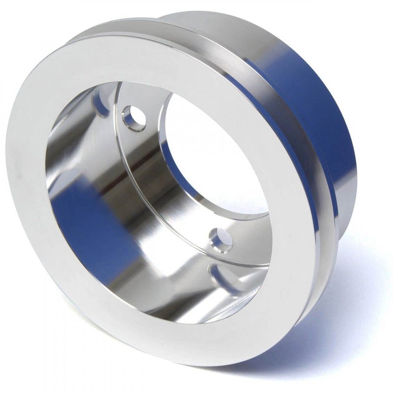 V-Belt Crankshaft Pulley for Ford Small Block - 4 Bolt Crank with 1 Groove. Made in the USA from 6061-T6 Billet Aluminum. Underdrive Ratio Increases Horsepower by 10 - 20 HP. Requires 4 Bolt Dampener and Drivers Side Lower Radiator Hose. Ford Passenger cars 1969 1/2+.
