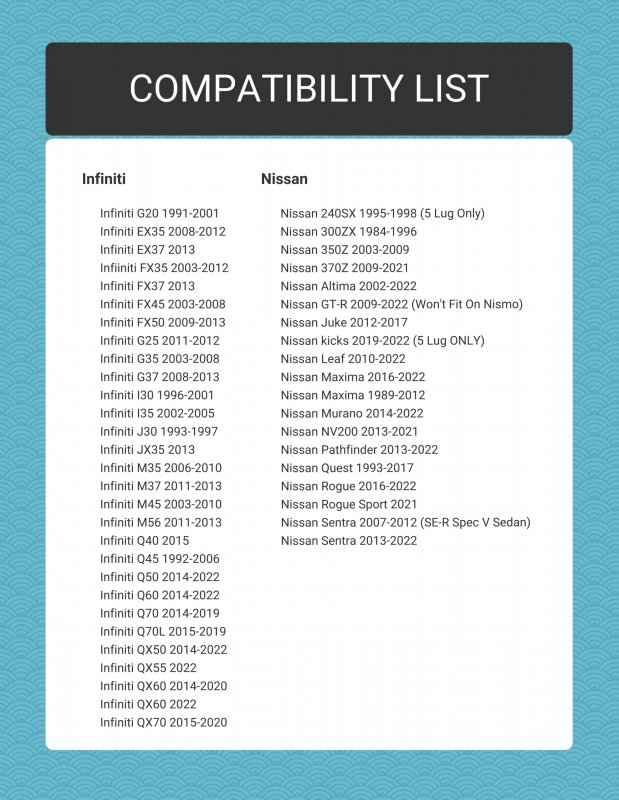 [Product Detail] Quantity: 2 Pieces. Width: 15mm. Bolt Pattern: 5x114.3 (Hub) to 5x100 (Wheel). Center Bore: 66.1 (Hub) to 54.1 (Wheel). Thread Pitch: 12x1.25 - Compatible For Nissan & Infiniti Hub (5x114.3) to mount 5x100 Wheels. Factory studs may need trimming if they are too long for the wheels to fit properly. [Fitment] Achieve Perfect Centering: This 5x114.3 to 5x100 adapter features a 66.1mm inner bore. Additionally, with a 54.1mm outer lip diameter (The center bore of the wheel must be 54.1mm or larger), hub rings can be utilized when the wheel bore size exceeds 54.1mm for seamless integration.. [Craftsmanship] Customadeonly wheel spacers are crafted by the automated CNC process in our 4 Axis machining center. Delivering consistent quality & precision to every product that produced which eliminates the balance issue that other brands may have.. [Quality] Premium Quality Construction: Crafted from 6061 T6 Aluminum, these wheel adapters offer exceptional durability and reliability. They are built to withstand the demands of daily driving, ensuring long-lasting performance..Other fine products