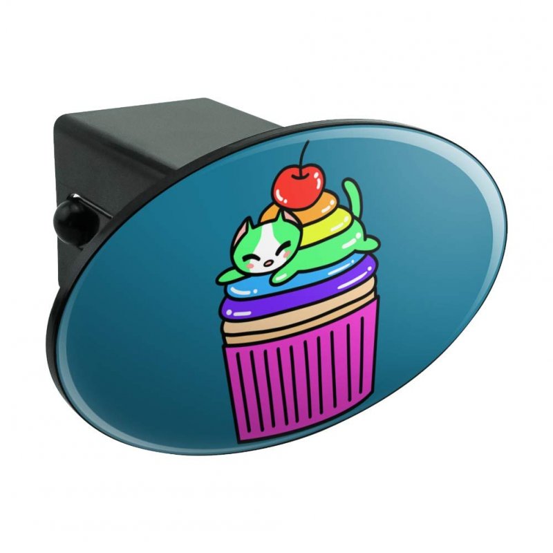- Cute Kawaii Lazy Cat In Rainbow Cupcake Oval Tow Trailer Hitch Cover Plug Insert