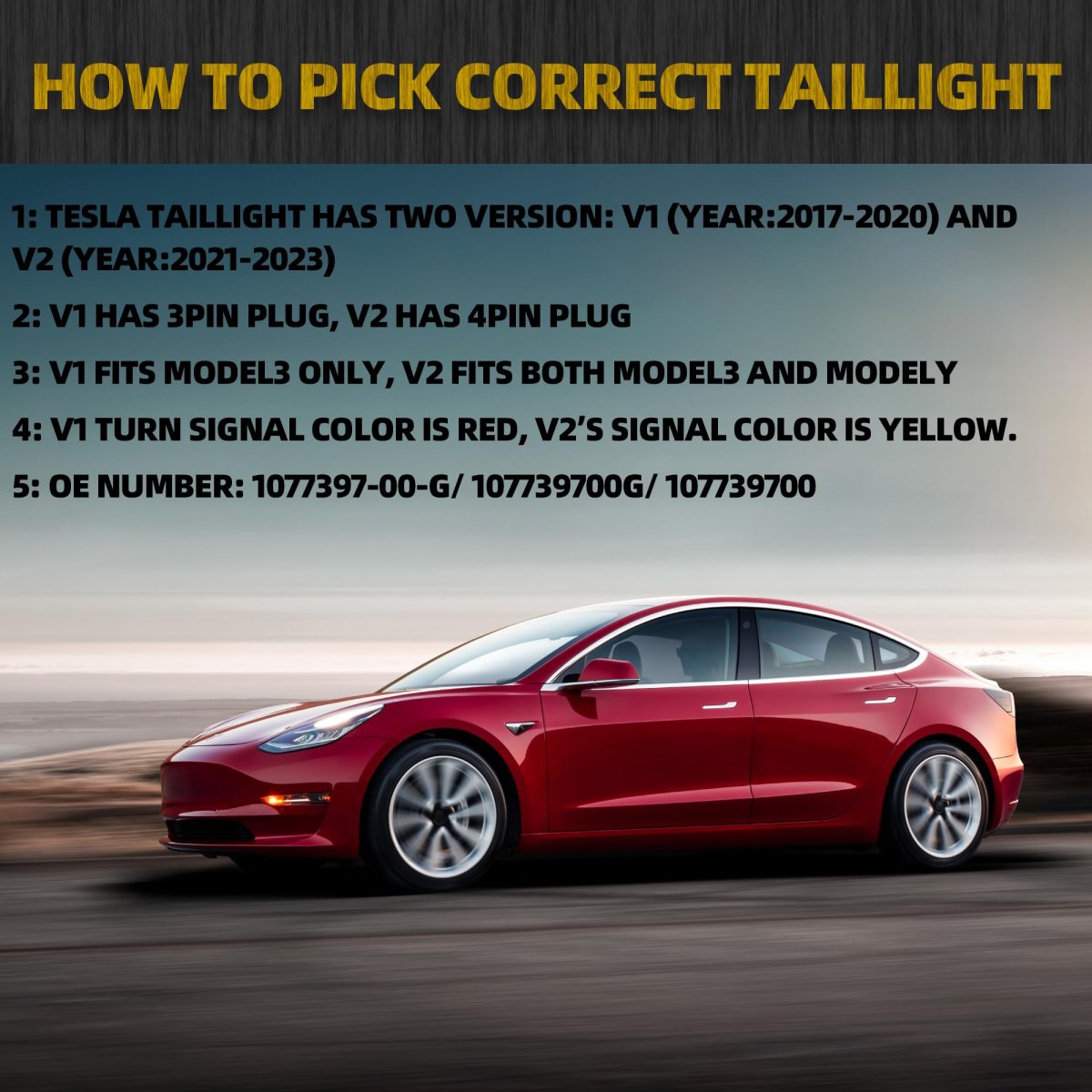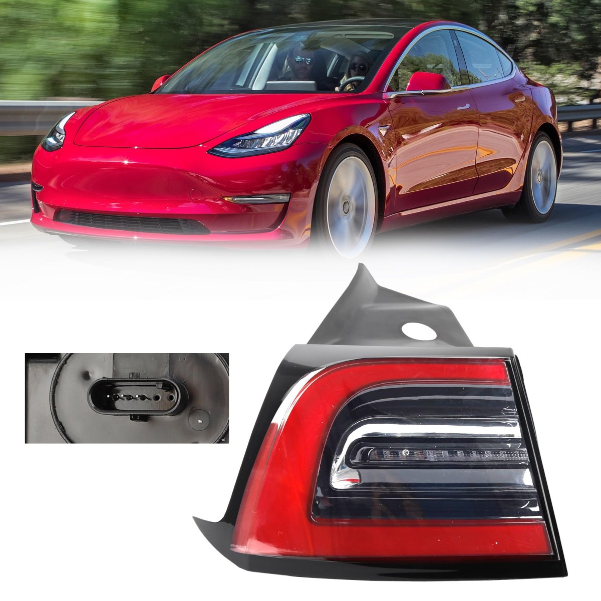 Comaptible ModelThe Tail Light Assembly Compatible With Tesla Model 3 2017 2018 2019 2020 2021 2022 2023, Rear Left Driver Side. AdvantageThis Driver Side Taillight is Led Light Source, Excellent Illumination And Can Work Perfectly In Rainy And Foggy Environment.Solve Problems Like Leak, Housing Split And Vapor Invasion. FeaturesThe Rear Light Made Of Red Lens And Black Housing ,The Shell Is Made Of ABS+PC Plastic, Waterproof, Dustproof, Anti-Fog.With LED Bulb And 3 Pin Connector. Based On Original Data, Direct Installation.Plug and play.