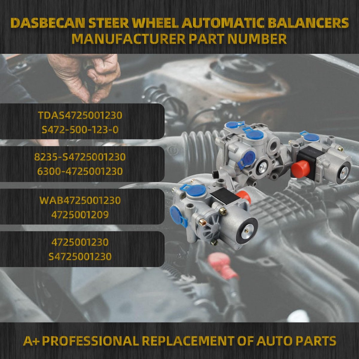 Replace The Rear ABS Valve Modulator replaces# TDAS4725001230, S472-500-123-0, 8235-S4725001230, 6300-4725001230, WAB4725001230, 4725001209,4725001230 S4725001230. FitmentThe Rear ABS Valve Modulator fits for Freightliner TDAS4725001230; Kenworth S472-500-123-0; MACK 8235-S4725001230; Mack 6300-4725001230; Meritor S4725001230; Navistar S4725001230; Peterbilt S472-500-123-0; Volve S4725001230; Volve WAB4725001230. Reliable The Rear ABS Valve Modulator is sturdy and reliable, providing long life,excellent heat dissipation,with good hardness and toughness, excellent heat dissipation, our Rear ABS Valve Modulator totally meets or exceeds OEM requirements.. Easy Installation The Wabco Valve Modulator adopts Original Equipment Manufacturer (OEM) parts with a 1:1 size design, ensuring compatibility with the original vehicle..Other fine products