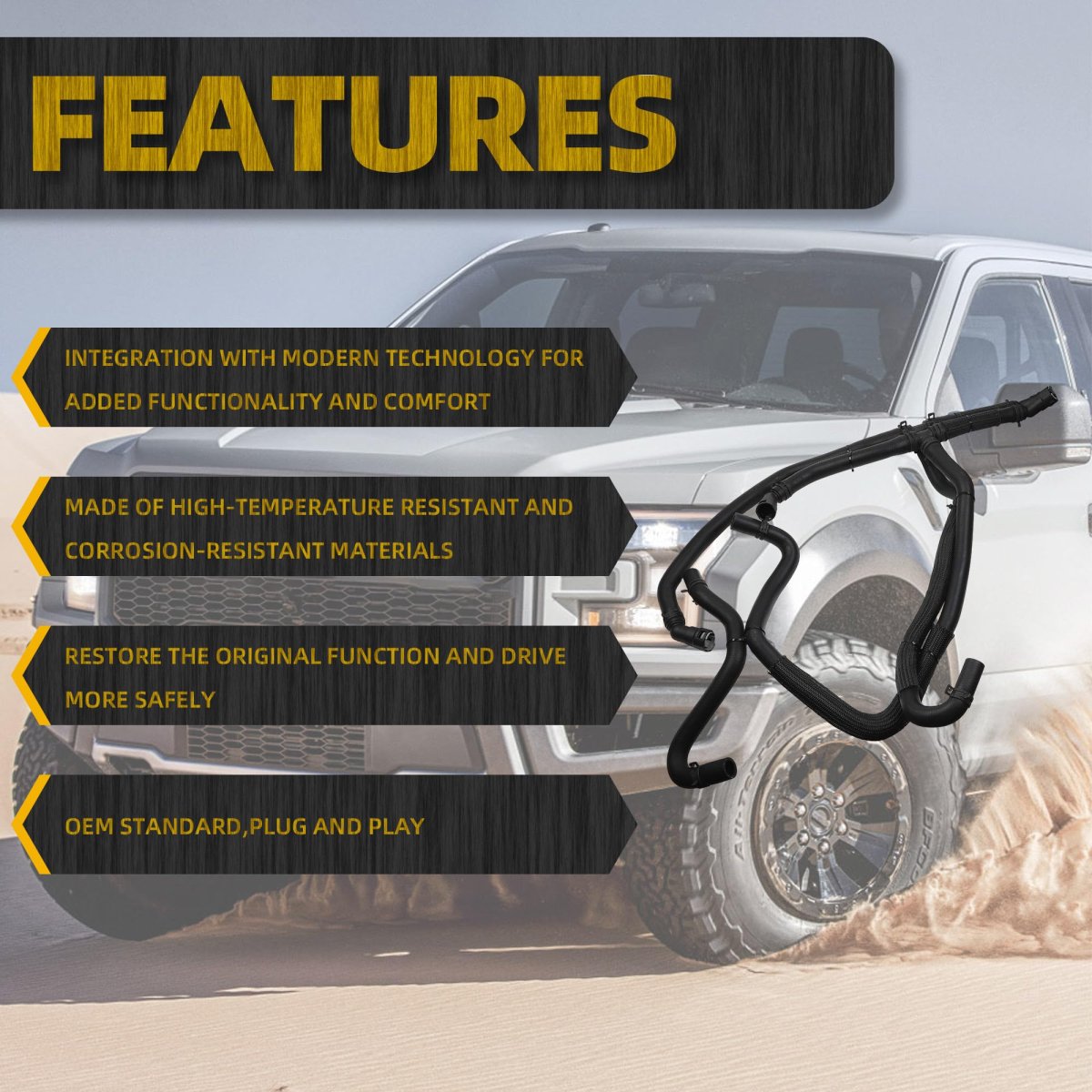 Advanced materialThe engine heating hose assembly has replaced the original plastic connector with a distributor made of A metal Y splitter, thereby providing higher durability and a longer service life. Manufacturer Part Number626-802. Compatible withFord F-150 2015 2016 2017. The product includes Engine Heater Hose Inlet & Outlet Assembly. Premium QualityIt offers quality comparable to that of the original factory, yet is more affordable. This product strictly complies with OEM standards, ensuring that each item reaches the original factory-level quality and performance, providing you with a reliable professional experience.Other fine products