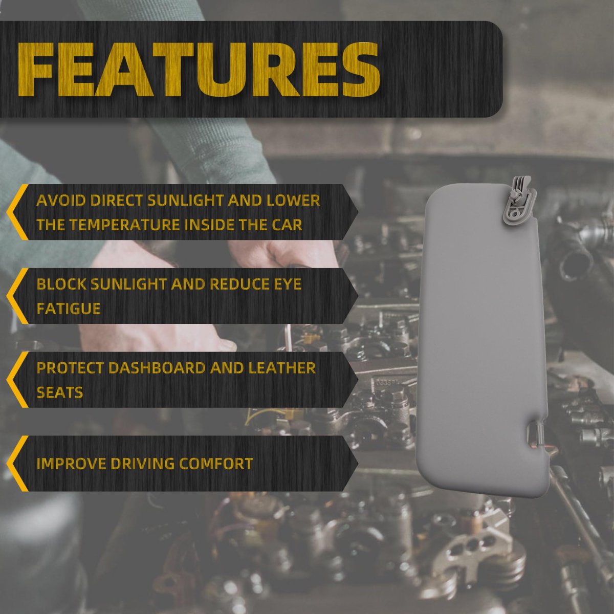 OE Number:This gray left driver side sun visor replaces: 85210-1R000,852101R000.. Sturdy Construction:Driver side sun visor uses high-strength materials and is suitable for extreme conditions.. Product Features:Replace your old and damaged sun visor with ease.Reduce direct sunlight to the driver's eyes, enhancing driving safety and comfort.. Easy installation:Front left sun protection shade meets OEM manufacturing standards and can be easily installed..Other fine products