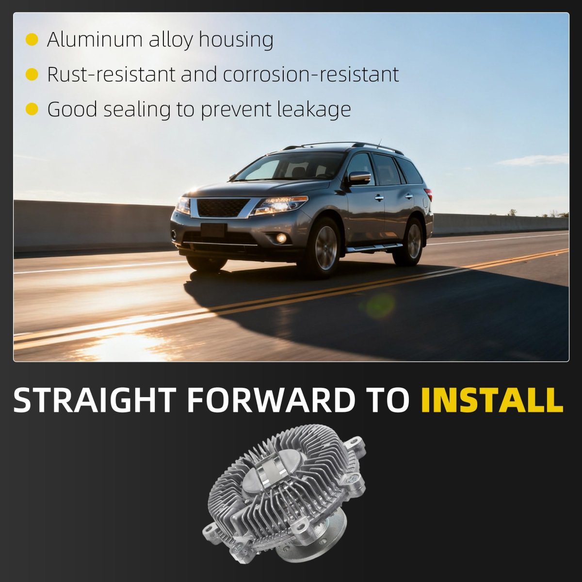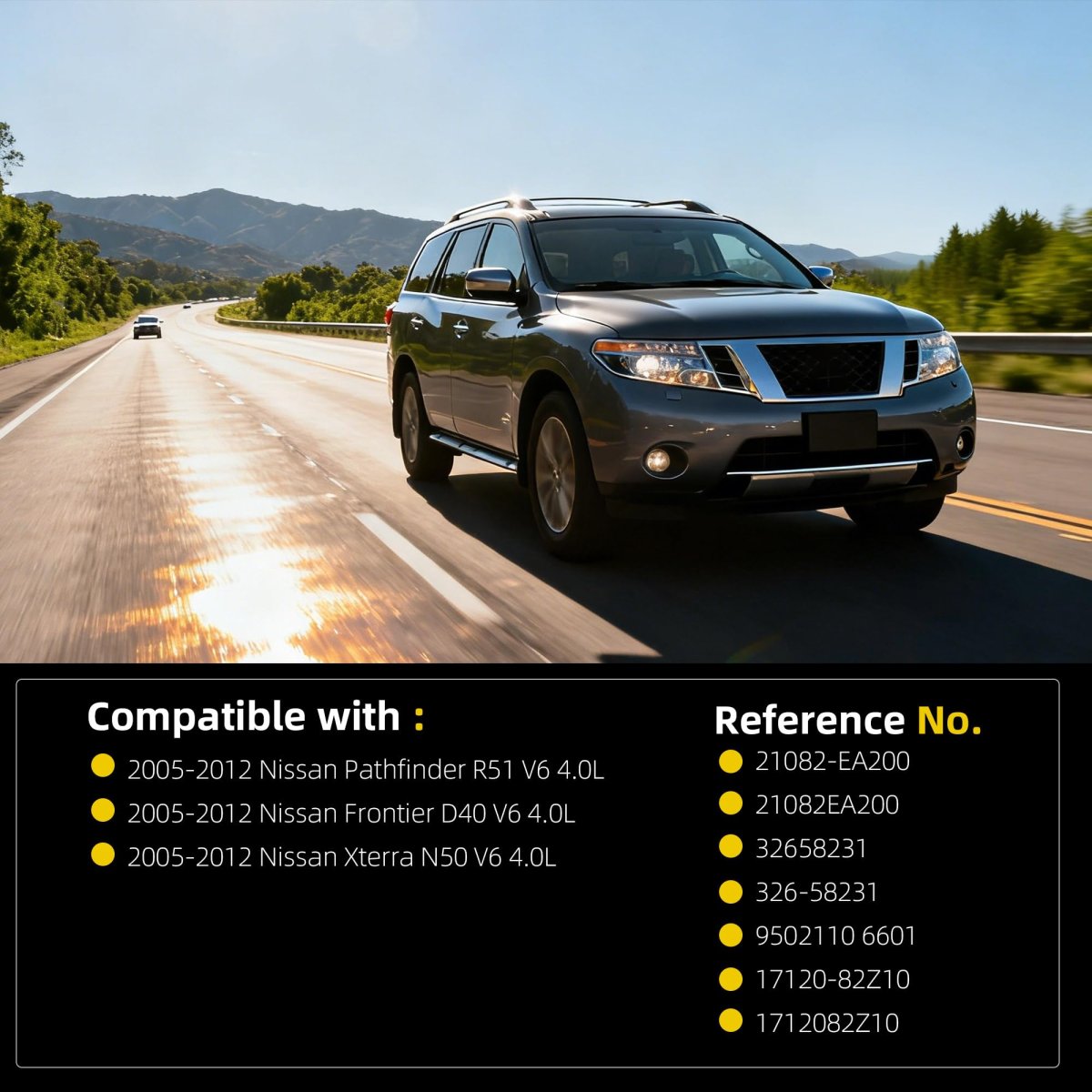 Manufacturer Part Number This Electric Radiator Cooling Fan Clutch replaces 21082-EA200, 326-58231, 21082EA200, 32658231, 9502110, 6601, 17120-82Z10, 1712082Z10. Compatible withNissan Pathfinder R51 2005-2012 V6 4.0L, Nissan Frontier D40 2005-2012 V6 4.0L, Nissan Xterra N50 2005-2012 V6 4.0L. Intelligent Temperature ControlIt has a built-in advanced temperature sensor that can automatically adjust the engagement and disengagement of the fan clutch according to the engine coolant temperature.. Reduce noiseUsing high-quality motor and transmission structure, it runs smoothly during operation, avoiding the impact and abnormal noise when the traditional clutch is engaged.. High ReliabilityThe electric radiator cooling fan clutch adopts high-quality materials and rigorous workmanship, with strong wear resistance and corrosion resistance, high reliability and long service life..Other fine products