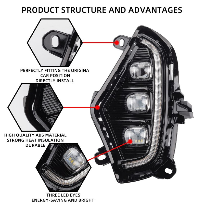 FitmentThe DRL led lights Compatible With Toyota RAV4 2019 2020 2021 2022 2023 (does not fit Adventure models). AdvantageToyota rav4 fog light is Three-eye LED light source,normal mode:white bar Turn signal light: yellow light, In bad weather,more Safer driving. FeaturesToyota rav4 daytime led light is made of ABS material, Strong heat insulationdurable, OEM Standard ,Perfectly fitting the original car position,directly install. Package list LED Daytime Running Light x1pair ,Wiring Harness with Digital Controller x1set.Other fine products