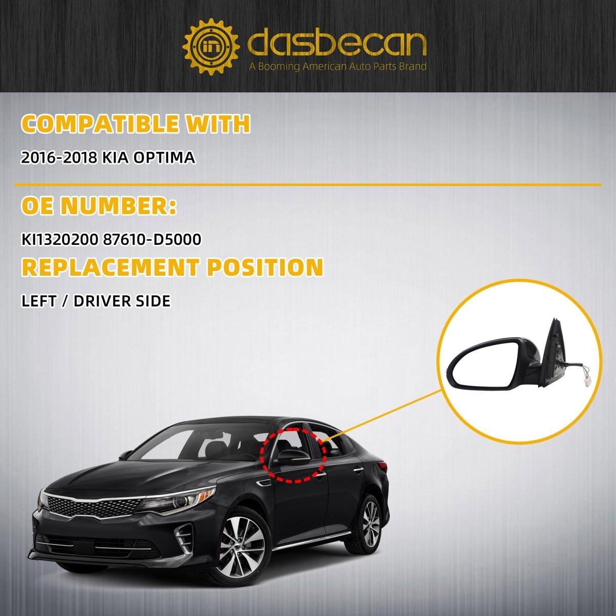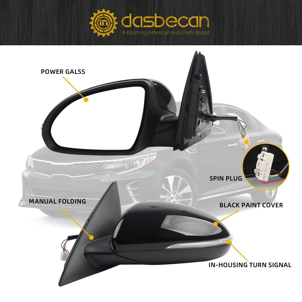 - Dasbecan Left Driver Side Mirror For 2016 2017 2018 Kia Optima Rearview With Signal Light Power Glass Manual Folding Black