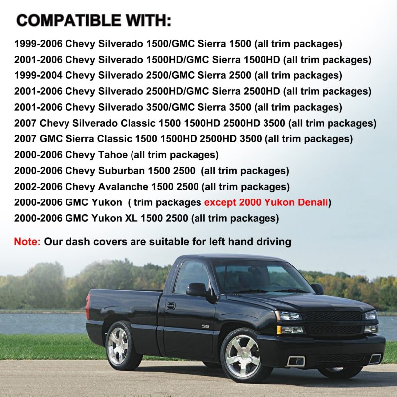 Compatible with: 2002-2006 Chevy Avalanche, 1999-2006 Chevy Silverado/2007 Silverado Classic, 1999-06 GMC Sierra/2007 Sierra Classic, 2000-06 Chevrolet Tahoe/Suburban, 2000-06 GMC Yukon/Yukon XL,Only fits models with 3 defrost vents near the window shield.. Our dashboard cover is suitable for left hand driving,which blocks againest sun damage; Protects against cracking; Cuts squint-inducing windshield glare, Cools your vehicles interior temperature by blocking dreadful sun rays from heating-up your dash.. All defrost vents are pre-cut,speakers are generally covered depending on the complexity of the speaker and/or if the speaker may be raised or not, but the sound can come through the cover fine due to the breathable material.. Velcro fasteners included for easy secure installation..