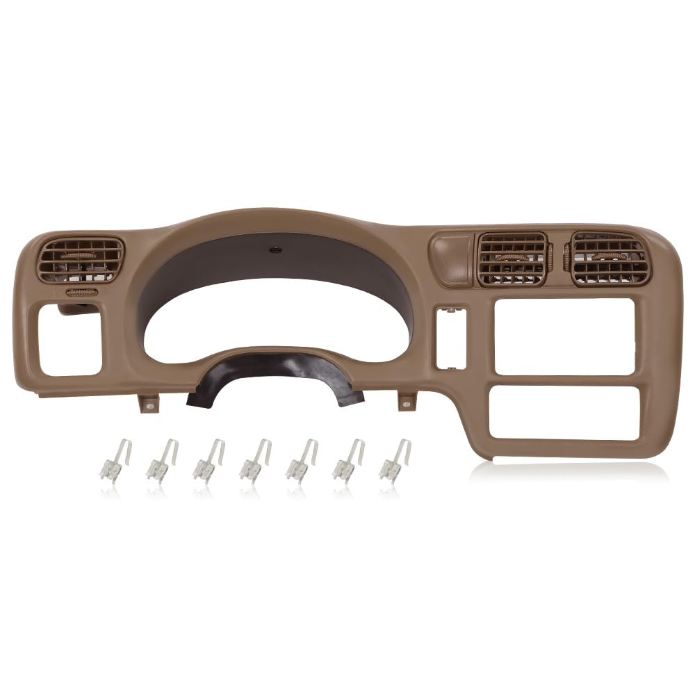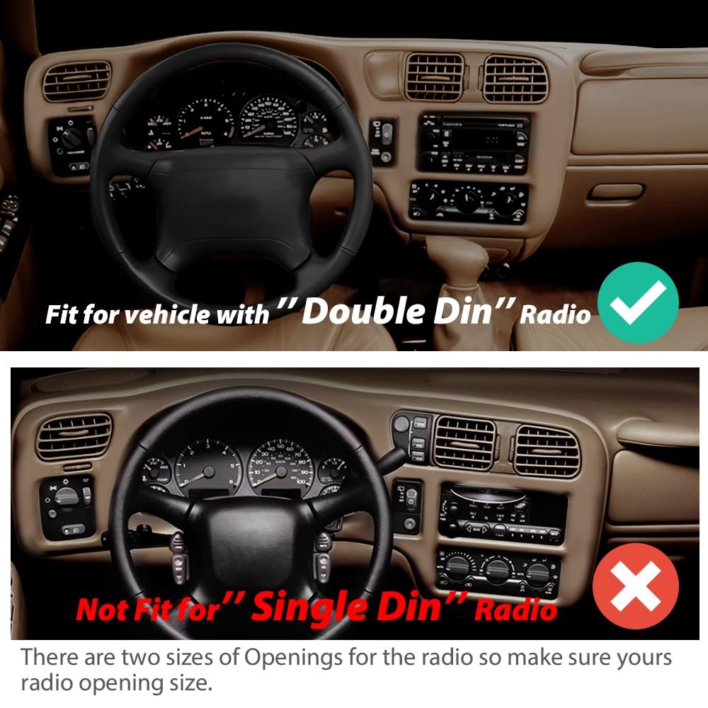 Compatibility:Compatible with Chevy Blazer S10 GMC Jimmy Sonoma 1998-2004.Fit for vehicle with Double Din Radio.. OE Standard:Meets the Original Equipment (OE) standards, ensuring replacement fit just like the original.. Good Protection:Dash cover trim panel can protects the dashboard or instrument cluster in all aspects, effectively waterproof and dustproof,prevents scratches, wear, and other damage caused by daily use or external factors.. Precision Design:Dash radio bezel has undergone precise measurement and seamlessly integrated design,that effectively reducing the gap with the dashboard structure,and enhances the overall appearance of the vehicle interior, making it look clean and finished.. Easy to Install:No modification required, easy to install, can be directly fixed to the roof preset device.Without instruction, professional Installation is highly recommended..Other fine products