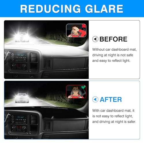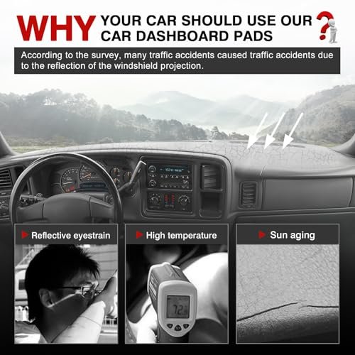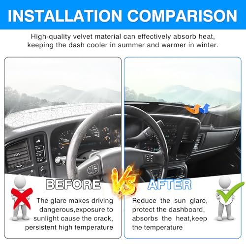 Custom Fit: With exact cutouts for your dashboard sensors and vents, this dashboard cover is specifically made for hevy Chevrolet Silverado/GMC Sierra 1999-2006, GMC Yukon XL/Chevy Suburban Tahoe Avalanche 2000-2006 LHD. Powerful Protector: Protect your dashboard from long-term sun exposure and UV rays, which may lead to cracking, discoloration, and warping. Autorder dash cover can help reduce sun glare from the dashboard and keep it looking brand-new. Giving you a comfortable and safe driving experience. Upgrade Velvet: Our dash mat is made of high-quality velvet fabric, which is light and soft and resistant to distorting, fading, and wrinkles. The thick black fluff layer effectively absorbs heat, keeping the dash cooler in the summer and warmer in the winter. Nonslip Design: Designed with densely silicone little dots on the back side, our dashboard mat features a nonslip that can better anti-slip, making it non-displacement.Well-made accessories for your dashboard. Easy Installation: Just place the dash cover straight on top of the dashboard and then fix the dash cover with seamless adhesive double-sided stickers. No worry about slipping.Other fine products