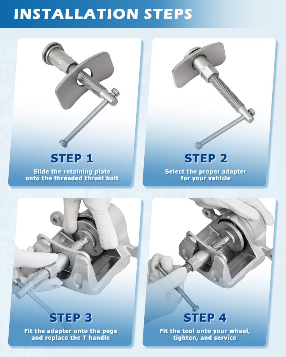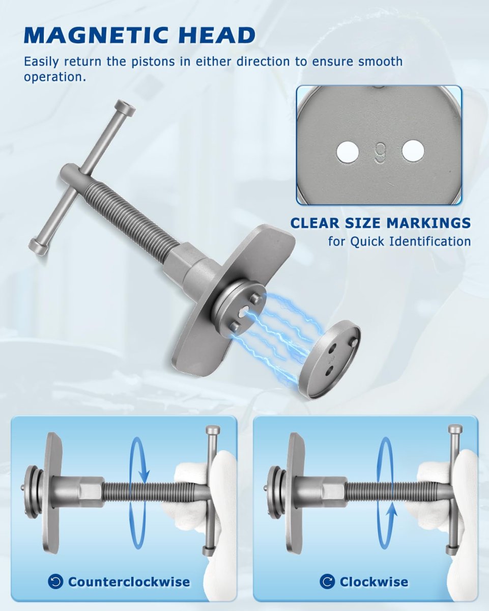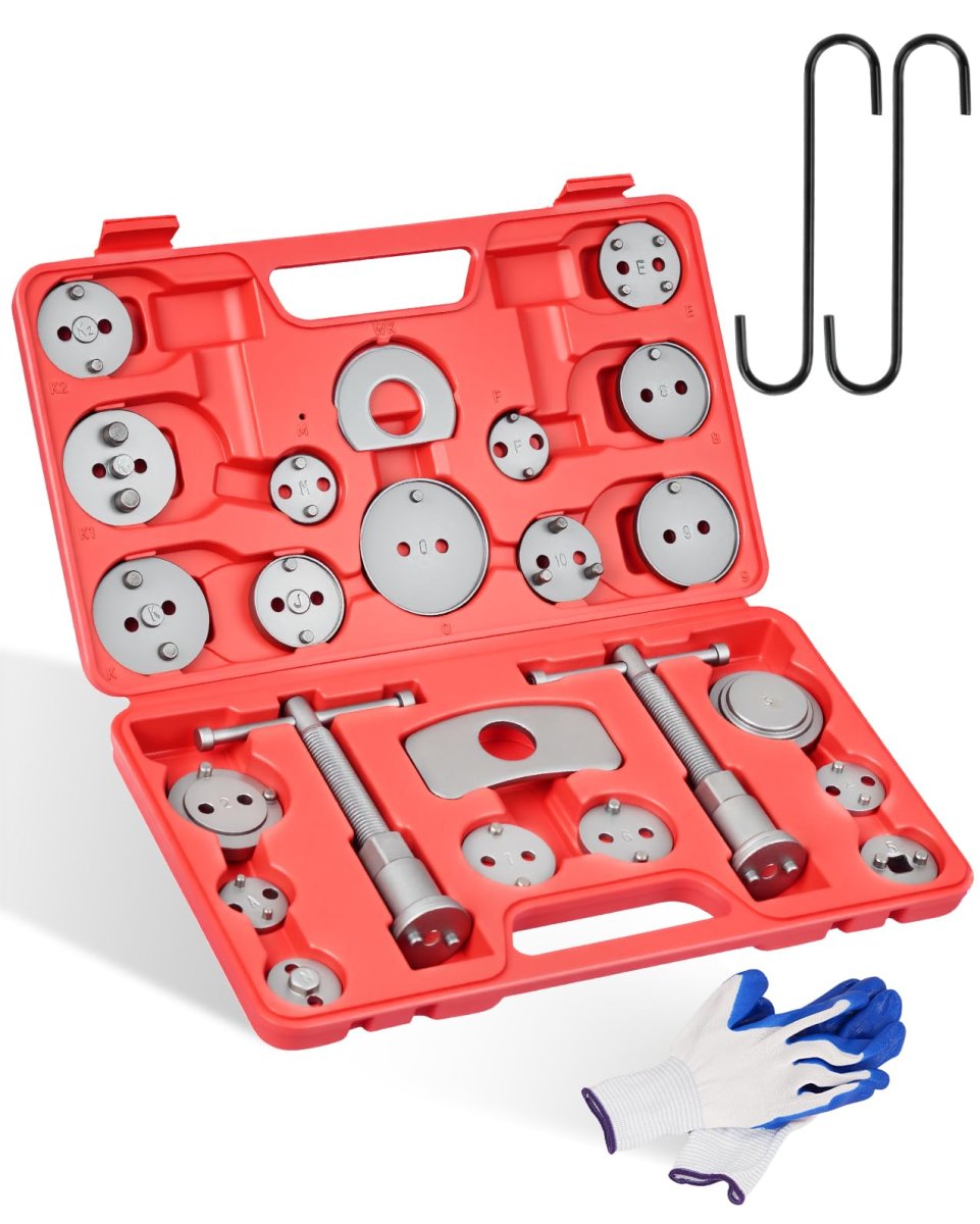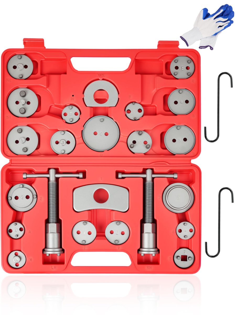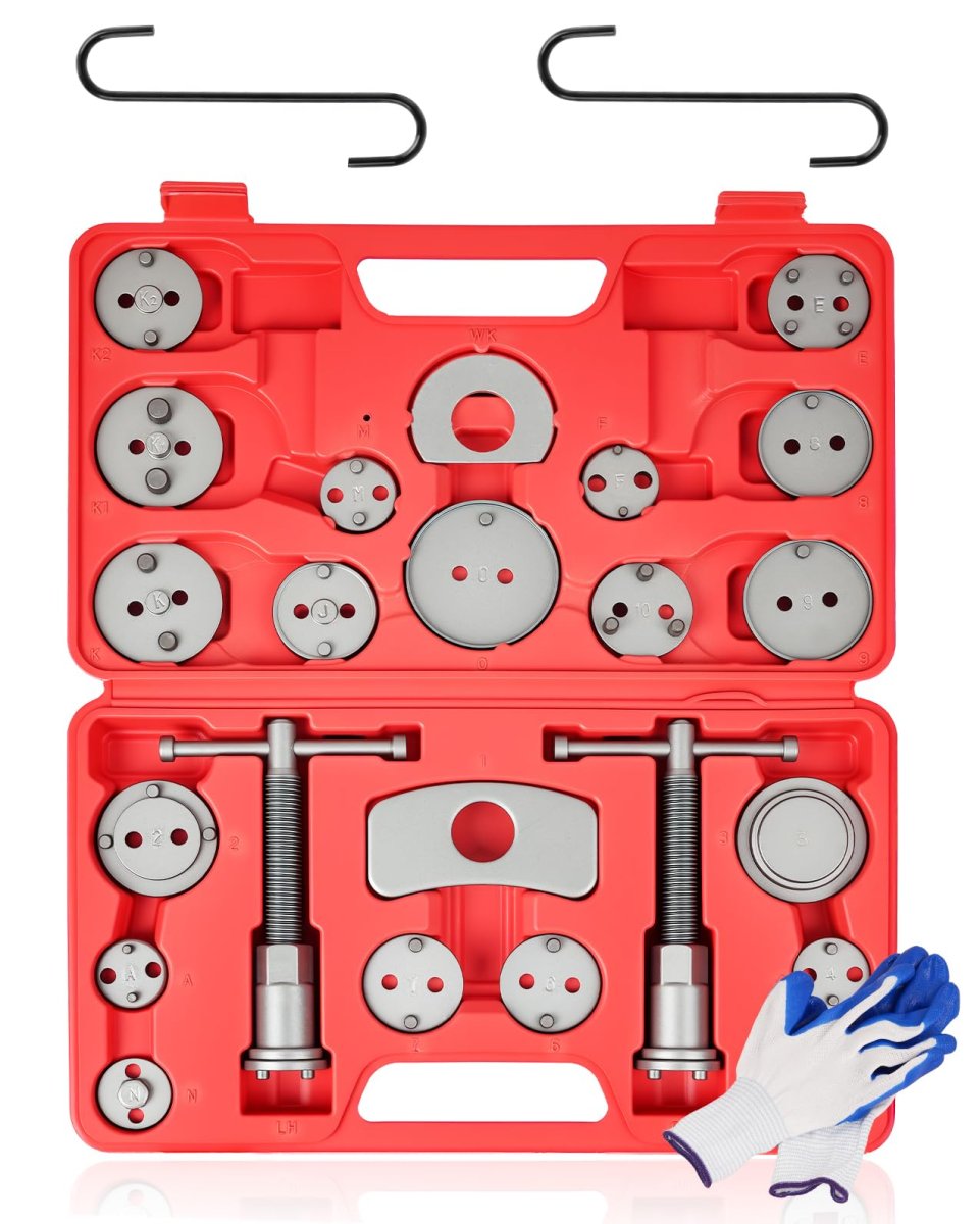 Package List: The 27pcs universal disc brake caliper piston compressor set includes 19 x Disc Adapters; 2 x Retainer Plates; 1 x Right Hand Thrust Bolt; 1 x Left Hand Thrust Bolt; 2 brake hangers; 2 x Work Gloves; 1 x Carry Case. Durable Build: Made from durable 45# carbon steel with a rust-resistant finish, this brake piston tool is built to withstand heavy-duty use. Its magnetic hand thrust bolt keeps disc adapters securely in place, preventing slippage and accidental drops during operation. Easy Operation: This brake caliper tool includes left and right hand thrust bolt assemblies for replacing brake pads and shoes; Attach the adapter plate, choose the right disc adapter and rotate the pistons into the caliper. Wide Compatibility: A built-in magnet in each thrust bolt assembly securely holds the drive key during use; It provides precise piston compression without washer damage and is suitable for almost cars trucks and four-wheel drive vehicles. Stay Organized: Equipped with a sturdy and durable blow-molded red casing; it is used for safe storage.Other fine products