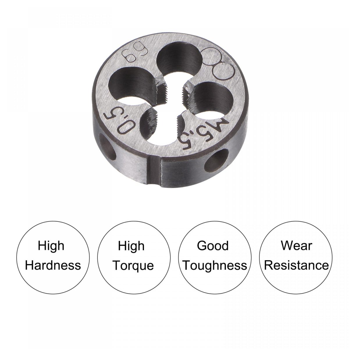 Die Stock Wrench Set: 20mm die stock fits M3.5-M6 dies, with adjustable screws. M5.5 x 0.5 threading round die with 20mm outside diameter, conical locking hole, strong locking and not loose. The round die has good abrasion resistance.. Round Die: Suitable for re-threading existing threads in hard materials like metal, or making new threads in soft material like plastic. Used for threading mild steel, aluminum, stainless steel, cast iron, alloy steel and carbon steel. Fit for general purpose threading.. Die Stock: Can help to repair broken bolts and threads or just remove bolts and threaded rod when used with round dies. With adjustable screws, it can securely hold round dies and is easy to operate. 45# carbon steel tool has high hardness, high strength and resistance to deformation than ordinary A3 steel.. Easy to Use: The positioning groove of the die should be aligned with the fastening screw in the middle of the die wrench, and the screw should be inserted into the slot of the die and tightened. Necessary tools for hand tapping operation, can improve the efficiency of processing threads.. Tips: It needs to be reversed every 1/41/2 turn to facilitate the chip discharge from the chip hole. Suitable lubricating oil should be added to the cutting edge of the die when tapping threads. Good for maintenance and repair work..Other fine products