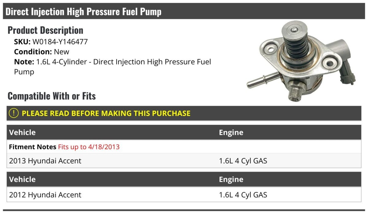 Compatible with or fits: (Note: Up To 4/18/2013 Vehicle Production) 2013 Hyundai Accent 1.6L 4 Cyl Gas. Compatible with or fits: 2012 Hyundai Accent 1.6L 4 Cyl Gas. Direct Injection High Pressure Fuel Pump Assembly. For 1.6L 4-Cylinder. Review Description to Ensure Proper Fit.Other fine products