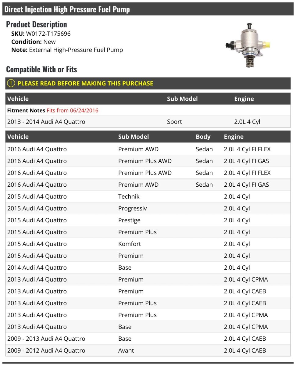 - Direct Injection High Pressure Fuel Pump For 2009-2016 Audi A4 Quattro Sedan