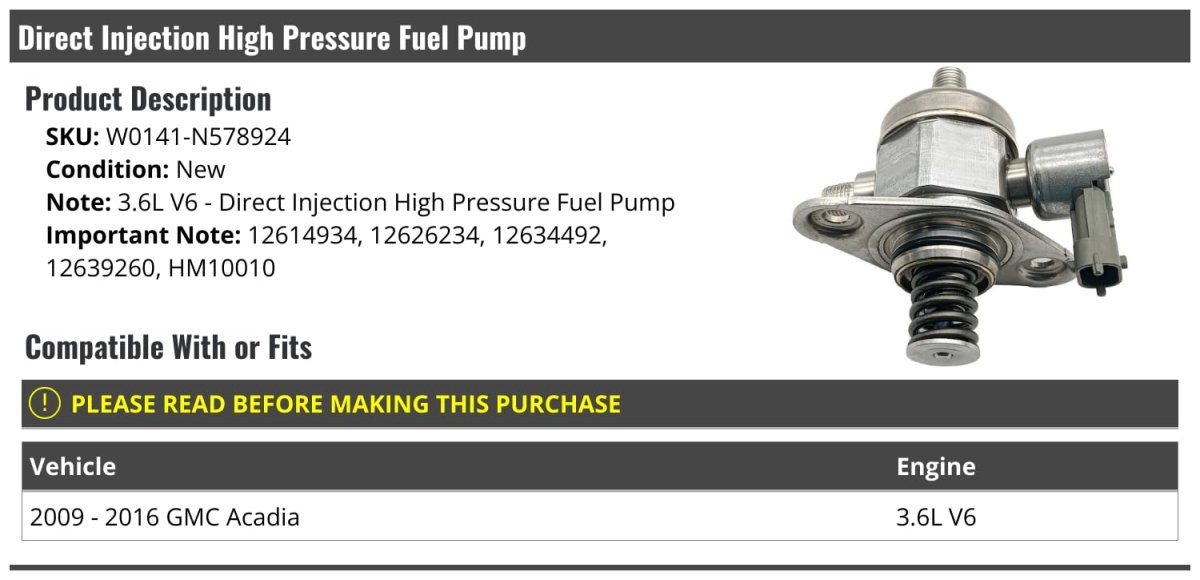 - Direct Injection High Pressure Fuel Pump For 2009-2016 Gmc Acadia 3 6l V6