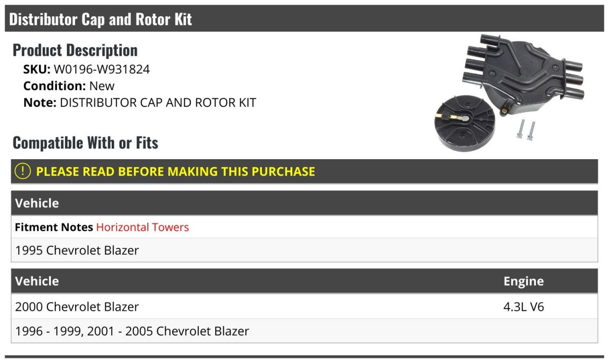 - Distributor Cap And Rotor Kit For 1995-2005 Chevy Blazer 4 3l V6