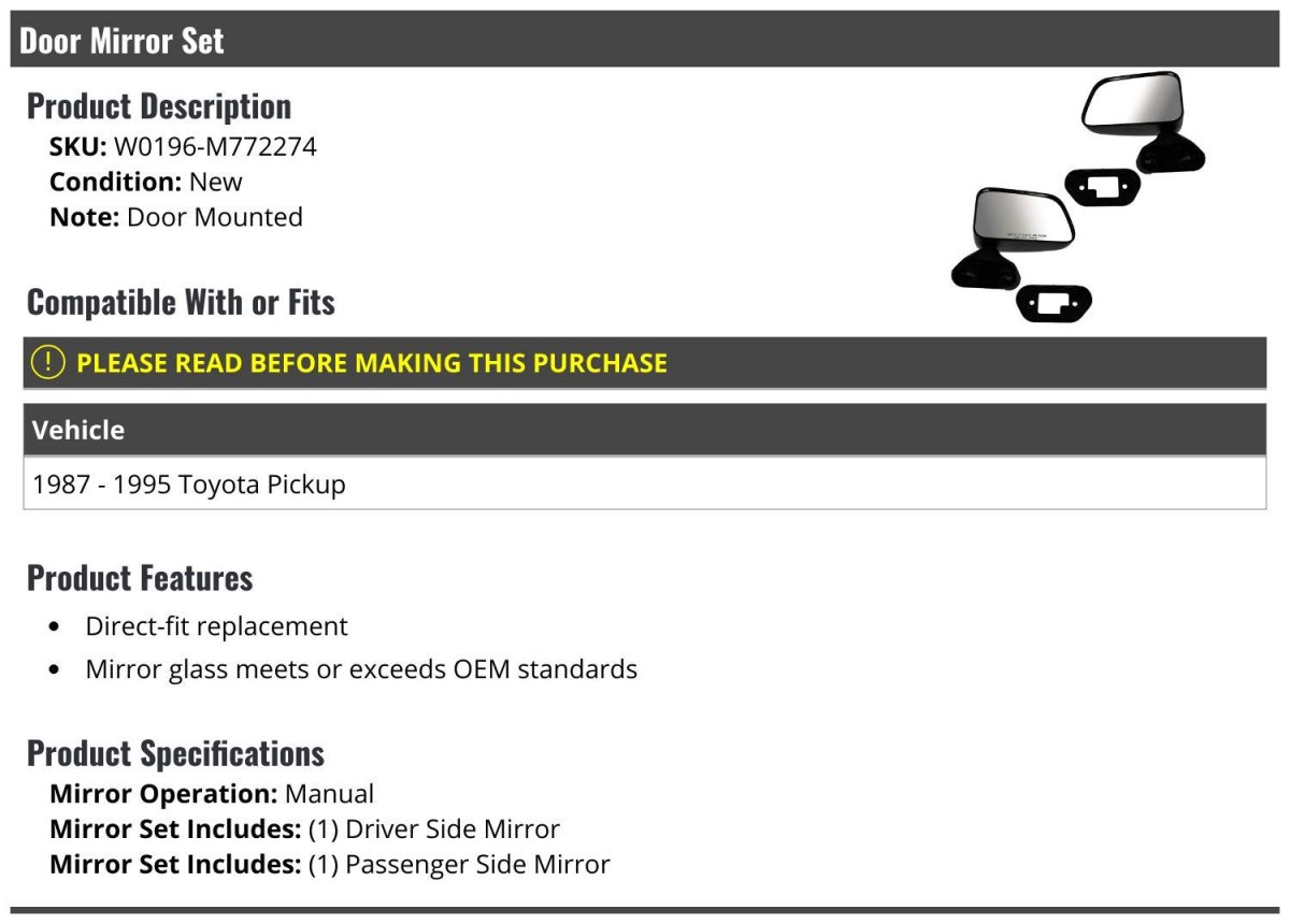 - Door Mirror Set Of 2 Manual Compatible With 1987-1995 Toyota Pickup