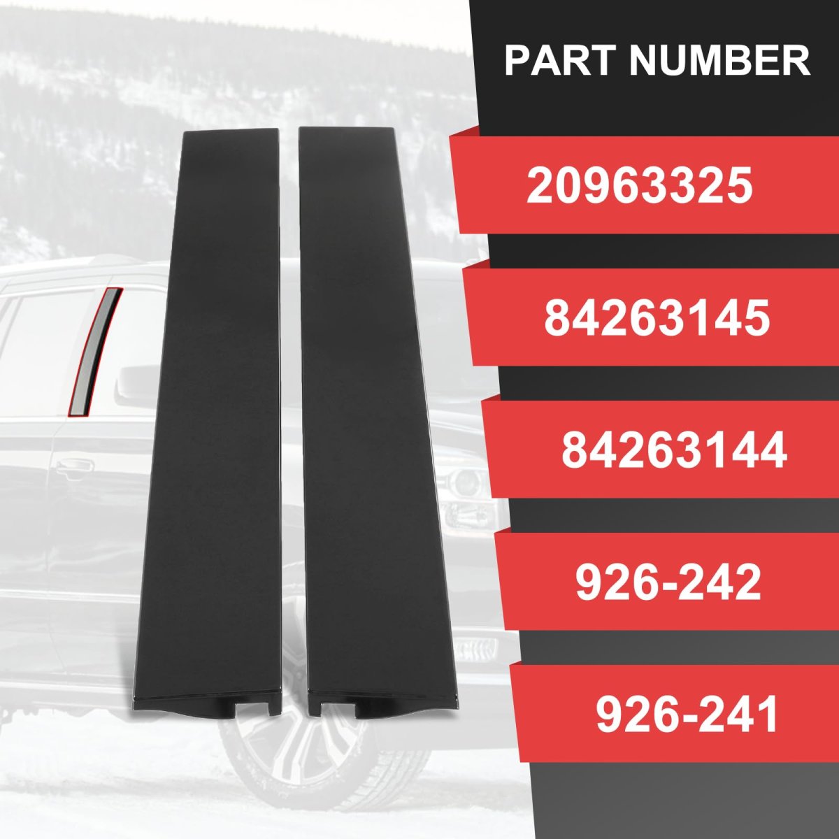 B pillar door trim molding:replacement for Cadillac Escalade ESV,Cadillac Escalade,Chevrolet Suburban,Chevy Tahoe,GMC Yukon XL 2015 2016 2017 2018 2019 2020,Suburban 3500 HD 2016 2017 2018 2019 2020.. Part Number:926-242,926-241,20963325,84263145,84263144.. Excellent Quality: Color: Gloss Black.made of ABS plastic, durable.Restore the look of your vehicle's exterior with a high gloss, high-grade crystal paint protective film.. Easy to install:Easy to install, no special tools required. Durable and manufactured in accordance with strict ABS quality control standards.. Package Included:1 x left driver side B pillar door molding,1 x right passenger side B pillar door molding..Other fine products