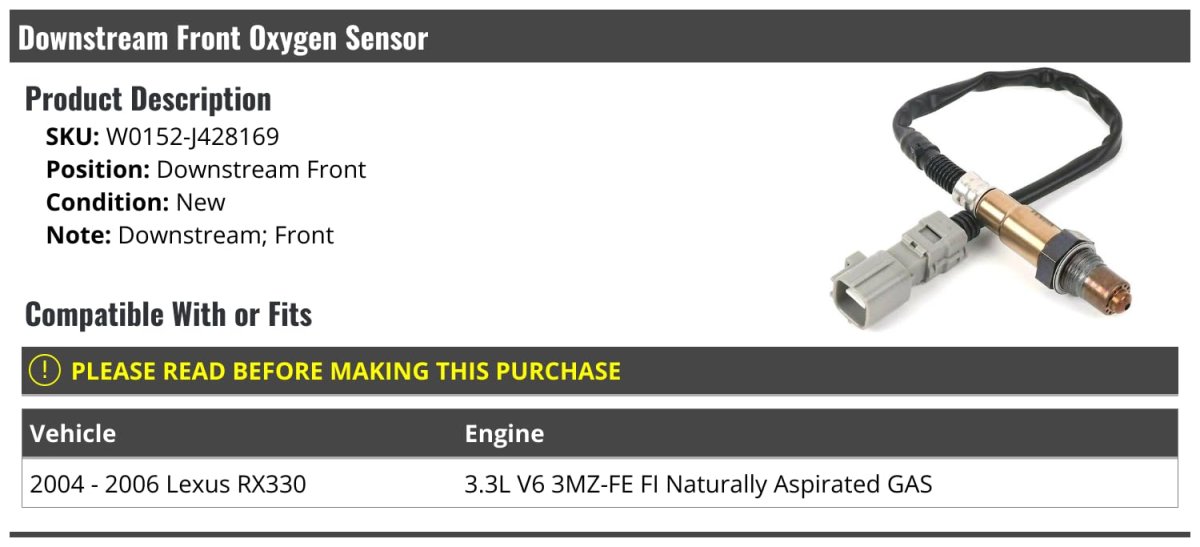 - Downstream Front Oxygen Sensor For 2004-2006 Rx330 3 3l V6 3mz-fe Fi Naturally Aspirated Gas