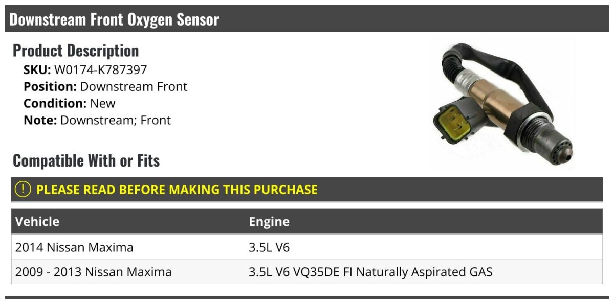 Compatible with or fits: 2014 Nissan Maxima 3.5L V6. Compatible with or fits: 2009 - 2013 Nissan Maxima 3.5L V6 VQ35DE FI Naturally Aspirated Gas. Downstream Front Oxygen Sensor. Review Description to Ensure Proper Fit. OE Quality.
