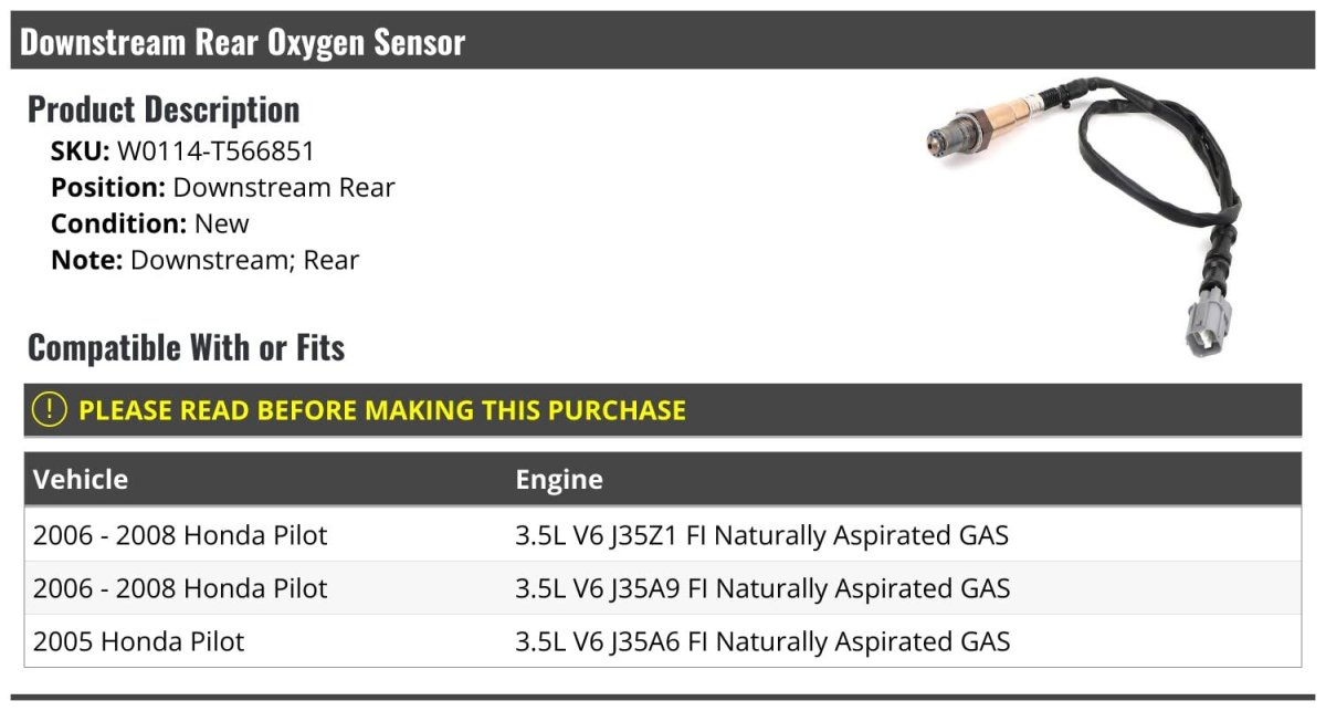 - Downstream Rear Oxygen Sensor For 2005-2008 Honda Pilot 3 5l V6 Naturally Aspirated Gas