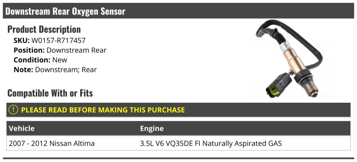 - Downstream Rear Oxygen Sensor For 2007-2012 Nissan Altima 3 5l V6 Vq35de Fi Naturally Aspirated Gas