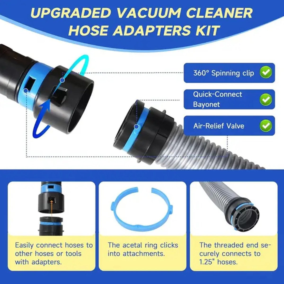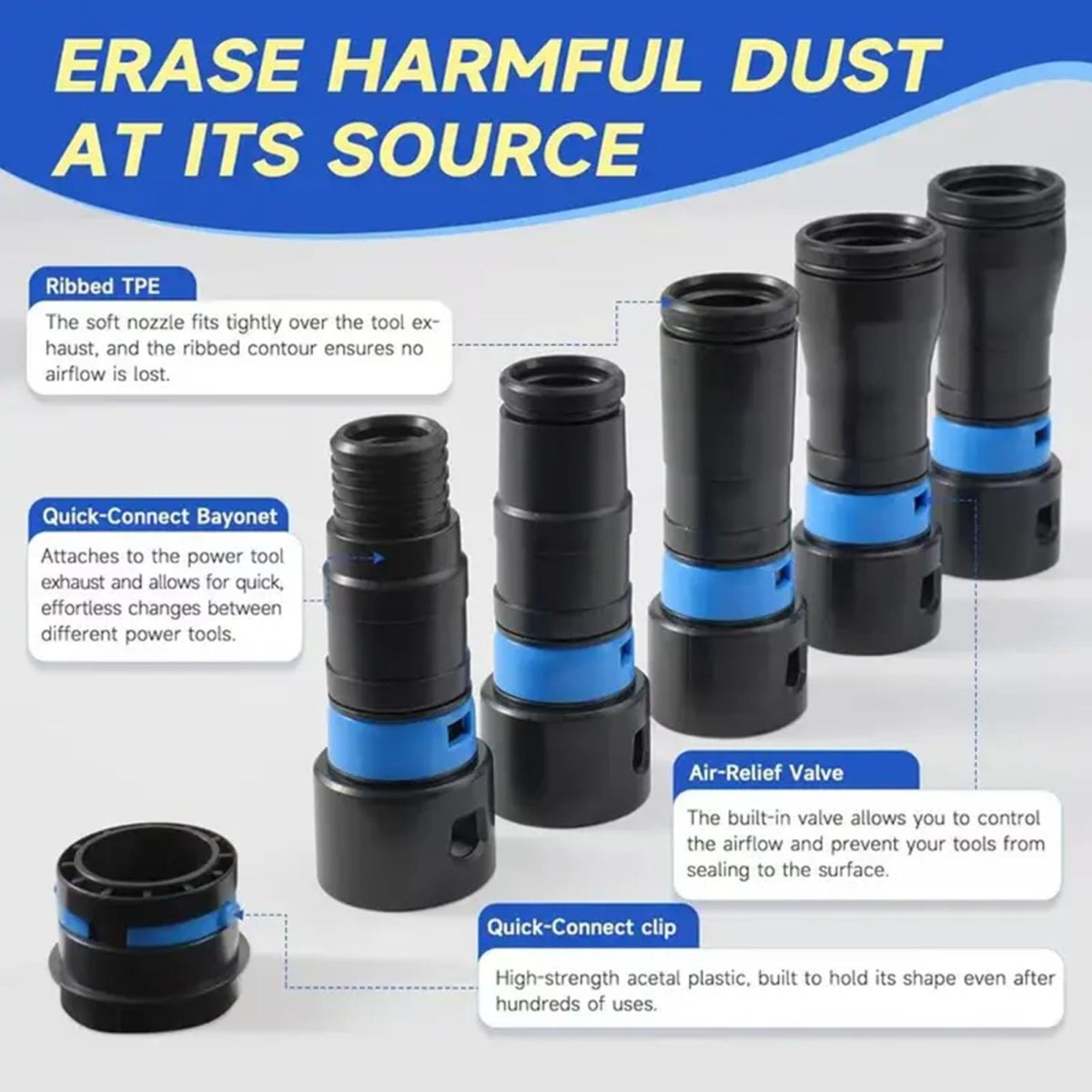 [Efficient Dust Removal]This 20ft dust collection hose is designed to keep your workspace clean by efficiently capturing debris from power tools.. [Versatile Connectors]Includes 6 quick-connect adapters to fit various tools and vacuum systems enhancing compatibility and convenience.. [Material]Constructed from durable TPE to withstand industrial use while maintaining flexibility for easy maneuvering.. [Easy Installation]The user-friendly design makes it simple to connect and disconnect, perfect for both home workshops and professional environments.. [Flexible Length]With a generous 20ft , this hose allows for free movement around your workspace, providing full dust extraction wherever you need it..Other fine products
