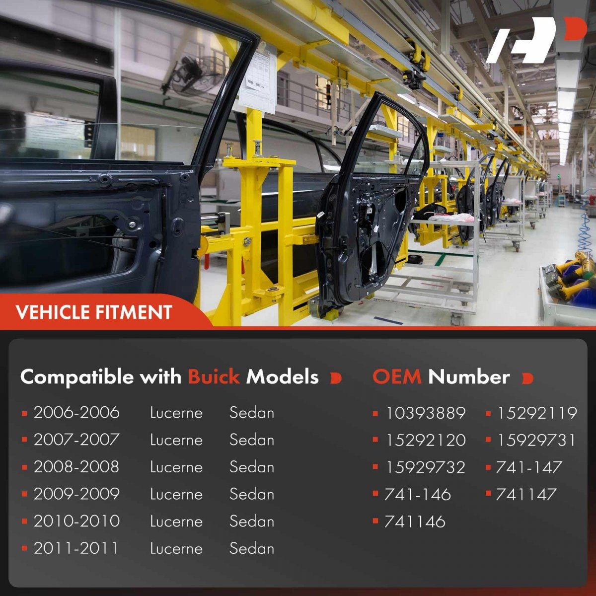 Directly FitOE Replacement Power Window Regulator with Motor, Directly Fit. Vehicle FitmentCompatible with Buick Lucerne 2006-2011 Sedan. PositionFront Left and Right (Front Driver and Passenger Side). Reference Number10393889, 15292120, 15929732, 741-146, 15292119, 15929731, 741-147.Other fine products