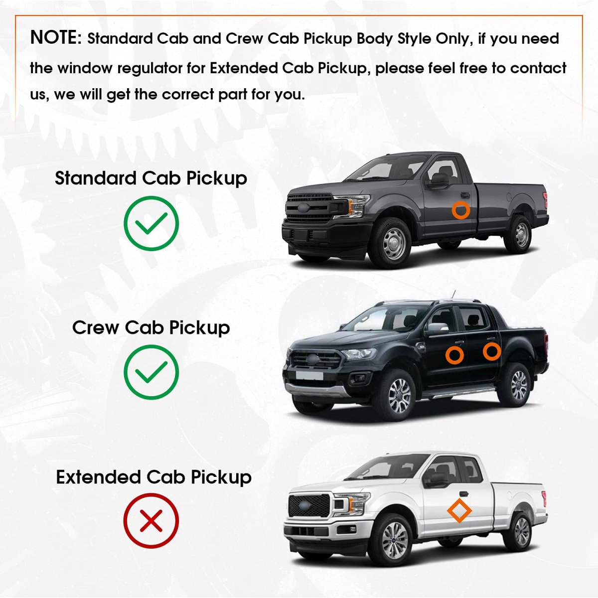 Directly FitOE Replacement Power Window Regulator with Motor; Directly Fit. Vehicle FitmentCompatible with Ford F-150 2004-2008 Standard or Crew Cab with 43.5'' wide doors, not for Extended Cab. PositionFront Right(Passenger Side). Reference Number741-429, 4L3Z1523200BA, 4L3Z1523200CA, 6L3Z1523200BA.Other fine products