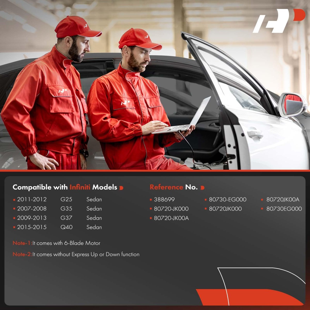 [Directly Fit]: OE Replacement Power Window Regulator with 6 Pins Motor, Directly Fit. [Vehicle Fitment]: Compatible with Infiniti G25 2011-2012 Sedan, G35 2007-2008 Sedan, G37 2009-2013 Sedan, Q40 2015 Sedan--- It comes without Express Up or Down. [Location]: Front Right Passenger Side. [Reference Number]: The A-Premium Window Regulator's reference number: 388699, 80720-JK000, 80720-JK00A, 80730-EG000, 80720JK000, 80720JK00A, 80730EG000. Before placing an order, verify that the part is compatible with your vehicle using the compatibility system..Other fine products