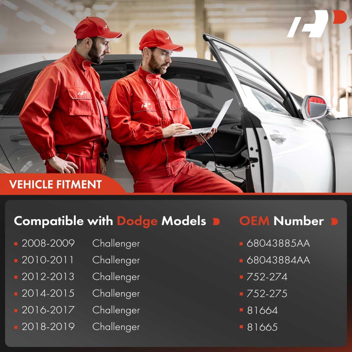 Directly FitOE Replacement Power Window Regulator Without Motor, Directly Fit. Vehicle FitmentCompatible with Dodge Challenger 2008-2019 Coupe. PositionFront Left and Right (Front Driver and Passenger Side). Reference Number68043885AA, 68043884AA, 752-274, 752-275, 81664, 81665.