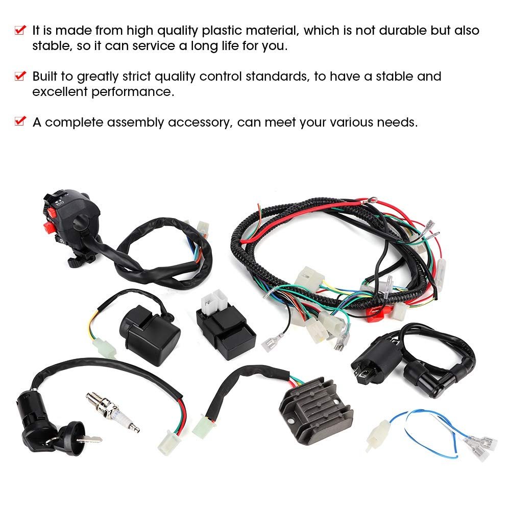 [Compatibility] Suitable for automatic and semi-auto atv quad bikes, as well as quads with upright engines.. [Material] It is crafted from premium plastic material, ensuring durability and stability for a long service life.. [Strict Quality Control] Built to strict quality control standards, this wiring harness ensures stable and excellent performance.. [Full Assembly Accessory] This complete kit includes all components, meeting a variety of needs for your atv quad bike..Other fine products