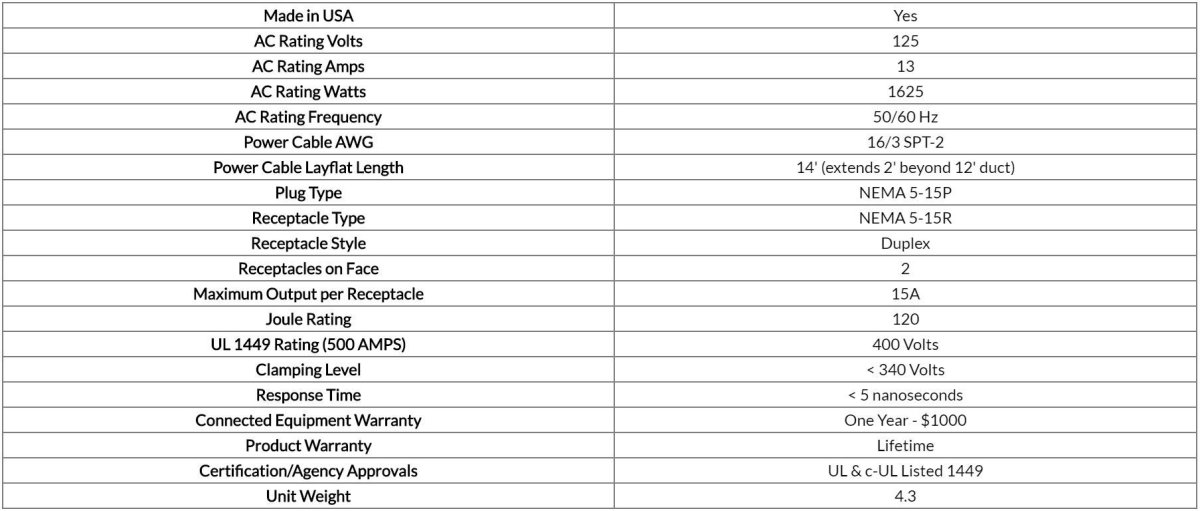 Made in the USA UL and c-UL Listed 1449 (NOT Intended for use UNDER Carpet or Rugs). Durable Withstands heavy foot traffic, Easy Installation ready to use, Grounded AC Duplex Receptacle. Dual Receptacle Outlet, 13 Amp, 125 Volt Rated Heavy Duty 16 AWG Flat Power cord extends two (2) feet beyond duct cover. Thermal fused, Maximum surge dissipation: 120 joules, Transverse protection (hot-neutral), Clamping time: less than 5 nanoseconds.
