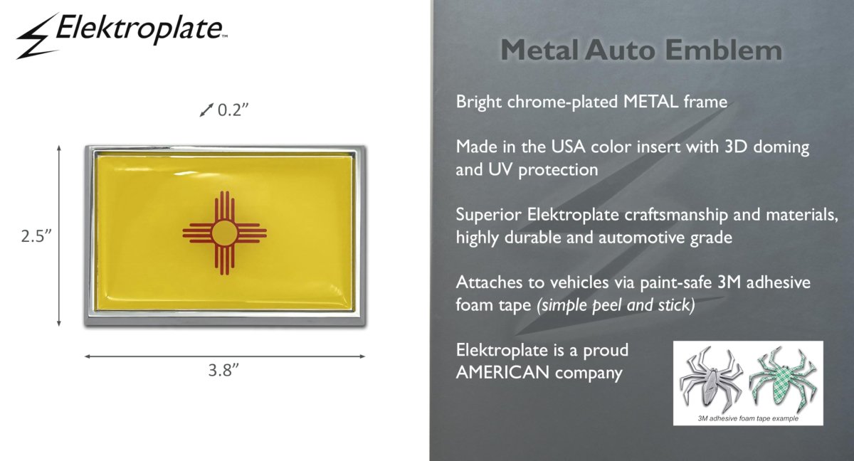 Premium Materials: - Chrome All Metal New Mexico NM State Flag Auto Emblem 2.5" x 3.8" x 0.2" with the highest plating specs on the market. Easy Installation: No Tools or Glue Needed - Emblems attach with a simple peel-and-stick application via paint-safe adhesive foam tape. : Exquisite craftmanship - Emblem will last for years and will not be affected by extreme weather or car washes. Universal Fit: Can be placed anywhere - All you need is a flat smooth surface.Other fine products