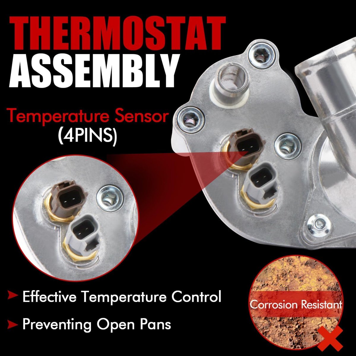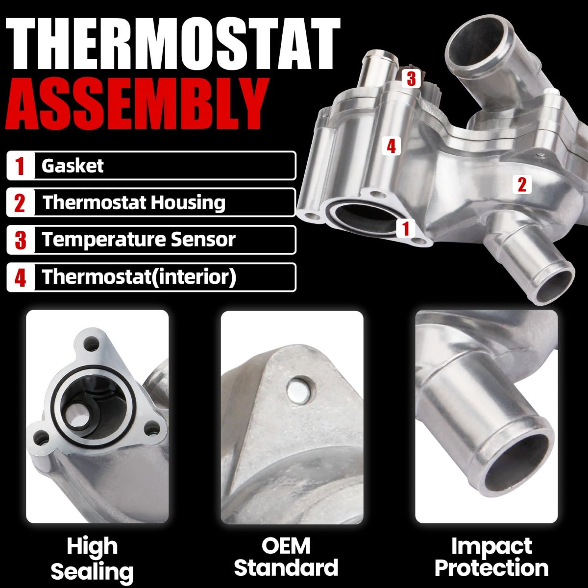 Great Value: Get more for your money with this thermostat assembly, providing excellent value for its price. PACKAGE: Thermostat assembly kit includes thermostat housing, thermostat, temperature sensor, gasket. DETAILS: Aluminum engine coolant thermostat housing assembly with Thermostat Housing, Thermostat, Temperature Sensor, Gasket, Bolt (Installed Already). Material: Aluminum. Thermostat Opening Temperature: 197.6 F. FUNCTION: Thermostat Housing ensures that the engine operates in the proper temperature range by regulating the amount of coolant entering the radiator and reducing engine wear. This coolant thermostat housing assembly is made of aluminum to provide maximum durability and improve performance.Other fine products