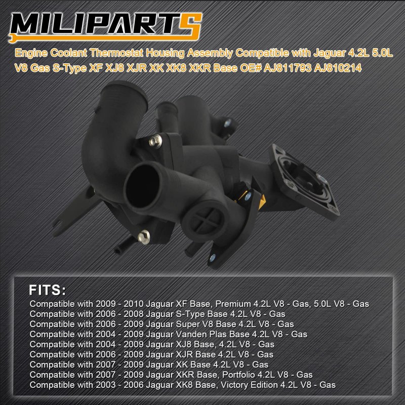 Compatible Auto 1 Compatible with 2009-2010 Jaguar XF, Compatible with 2006-2008 Jaguar S-Type, Compatible with 2006-2009 Jaguar Super V8, Compatible with 2004-2009 Jaguar Vanden Plas, Compatible with 2004-2009 Jaguar XJ8.. Compatible Auto 2Compatible with 2006-2009 Jaguar XJR, Compatible with 2007-2009 Jaguar XK, Compatible with 2007-2009 Jaguar XKR, Compatible with 2003-2006 Jaguar XK8.. OE Part Numbers AJ811793, AJ810214.. Package Includes 1 Coolant Thermostat Housing Assembly. Some Thermostats Are Integrated Into Housing Assemblies, thermostats are part of an integrated housing assembly located on the engine block or cylinder head. A pipe on the housing acts as the coolant outlet..