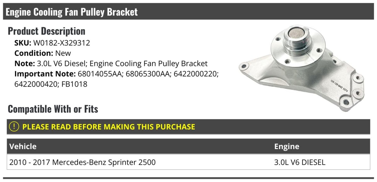 3.0L V6 Diesel; Engine Cooling Fan Pulley Bracket. OE Quality. Compatible with or fits: 2010 - 2017 Mercedes-Benz Sprinter 2500 3.0L V6 Diesel. Engine Cooling Fan Pulley Bracket. Review Description to Ensure Proper Fit.