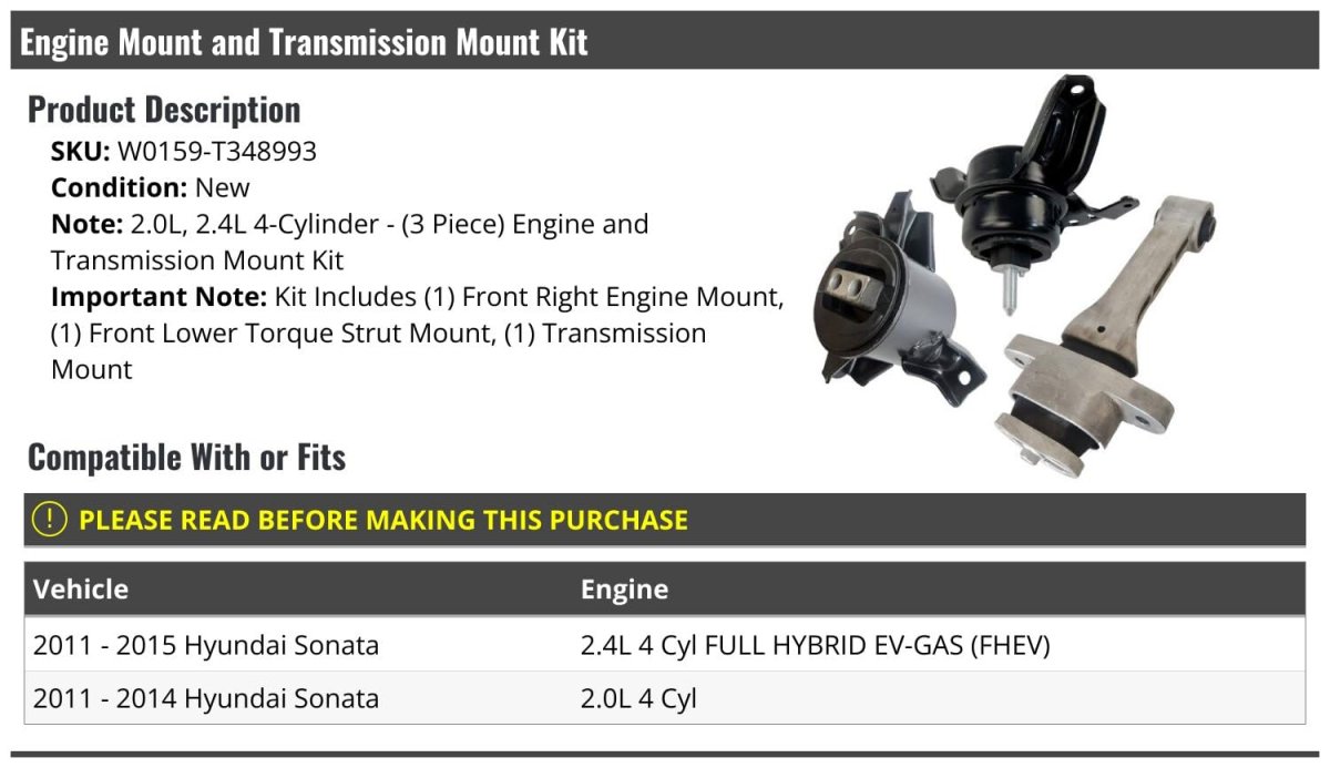 Compatible with or fits: 2011 - 2015 Hyundai Sonata 2.4L 4 Cyl FULL HYBRID EV-GAS (FHEV). Compatible with or fits: 2011 - 2014 Hyundai Sonata 2.0L 4 Cyl. Kit Includes: (1) Front Right Passenger Side Engine Motor Mount - (1) Front Lower Torque Strut Mount - (1) Transmission Mount. (3-Piece) Engine Motor Mount and Transmission Mount Kit. Review Description to Ensure Proper Fit.Other fine products