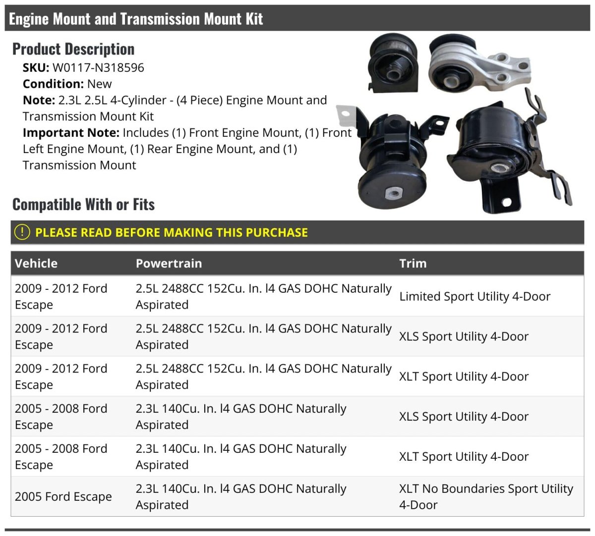 - Engine Motor Mount And Transmission Kit 4-piece For 2005-2012 Ford Escape