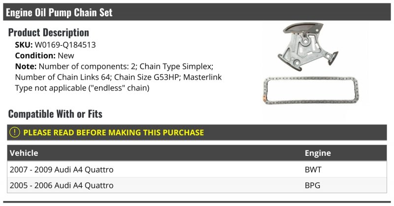 Number of components: 2; Chain Type Simplex; Number of Chain Links 64; Chain Size G53HP; Masterlink Type not applicable ("endless" chain). Compatible with or fits: 2007 - 2009 Audi A4 Quattro BWT. Compatible with or fits: 2005 - 2006 Audi A4 Quattro BPG. Review Description to Ensure Proper Fit.Other fine products