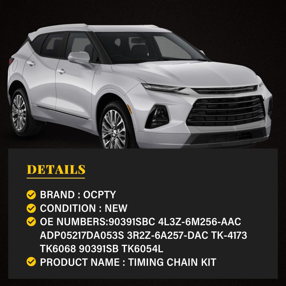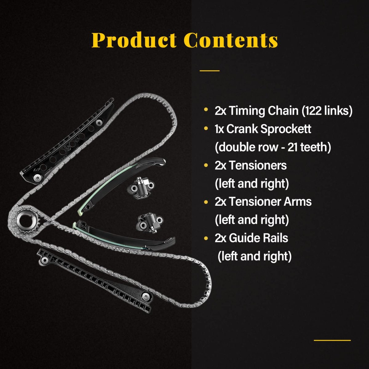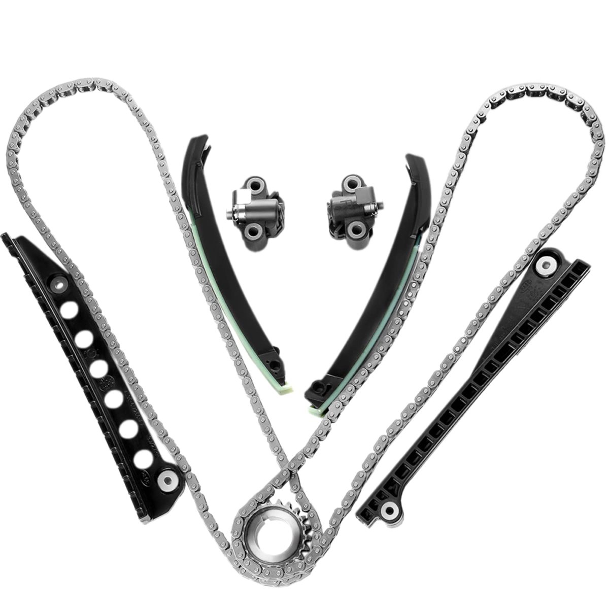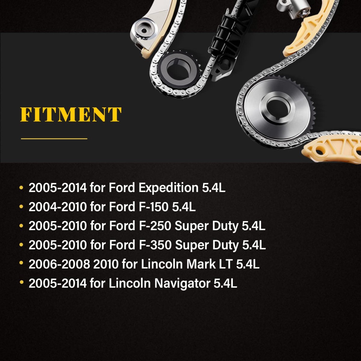 Vehicle Fitment: Compatible with 2005-2008 for Ford Expedition 5.4L,2004-2008 for Ford for F-150 5.4L,2005-2008 for Ford for F-250 Super Duty 5.4L,2005-2008 for Ford for F-350 Super Duty 5.4L,2006-2007 for Lincoln Mark LT 5.4L,2005-2008 for Lincoln Navigator 5.4L. Replaces Part: 5L3Z6268A,F6TZ6268AA,XL3Z6306AA,F6AZ6L266CA,1L3Z6L266AA,F85Z6K255AA,95430,F85Z6M274AA,2L1Z6K297AA,4L3Z6M256AA,C391,S869,95338,95433,95397,95396,95431,TK6068. What You Get: 2x Timing Chains (122 Links),1x Crank Sprocket (double row 21 teeth),1x Tensioners (left),1x Tensioners (right),1x Guide rails (tensioner rail left),1x Guide rails (tensioner rail right),1x Guide rails (left ),1x Guide rails (right).Other fine products