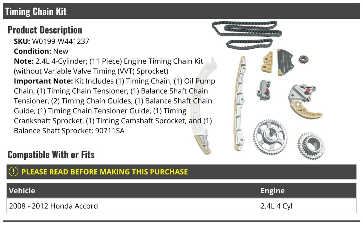 Compatible with or fits: 2008 - 2012 Honda Accord 2.4L 4 Cyl. Includes: (1) Engine Timing Chain - (1) Oil Pump Chain - (1) Timing Chain Tensioner - (1) Balance Shaft Chain Tensioner - (2) Timing Chain Guides - (1) Balance Shaft Chain Guide - (1) Timing Chain Tensioner Guide - (1) Timing Crankshaft Sprocket - (1) Timing Camshaft Sprocket - (1) Balance Shaft Sprocket. (11-Piece) Engine Timing Chain Kit - (without Variable Valve Timing (VVT) Sprocket). OE Quality. Review Description to Ensure Proper Fit.