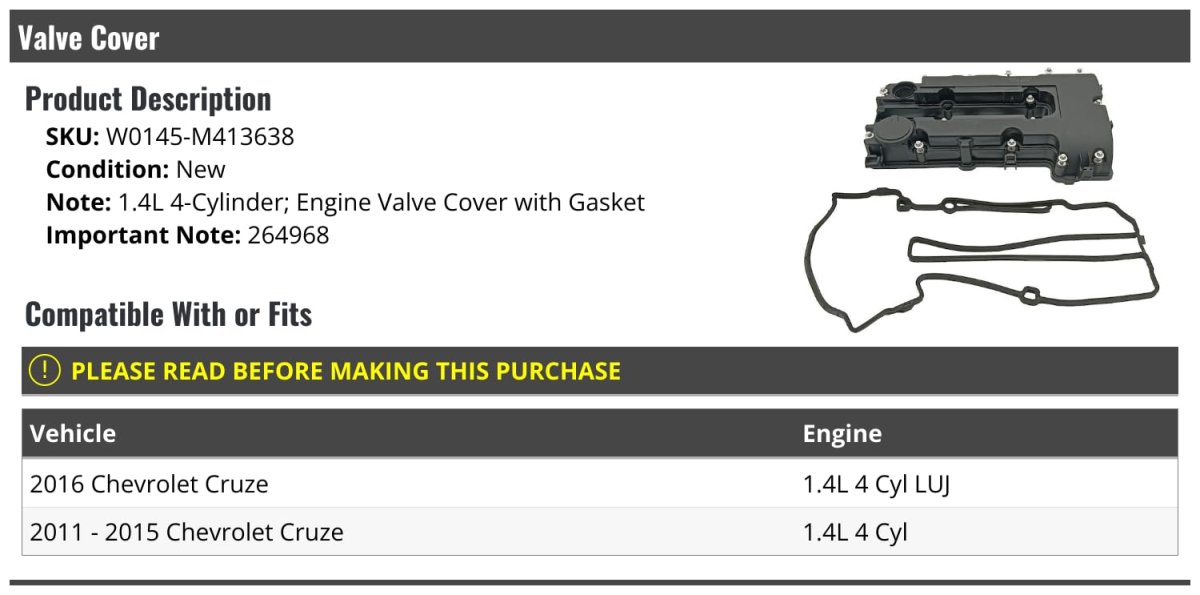 - Engine Valve Cover With Gasket For 2011-2016 Chevy Cruze 1 4l