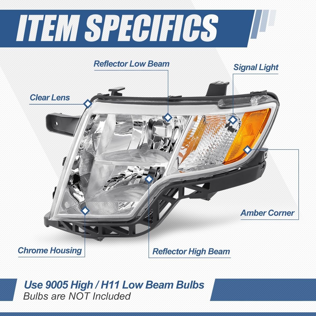 Vehicle Compatibility - Headlight assembly compatible with Ford Edge 2007-2010.. Improve Visibility and Appearance - Come with [1] driver left side headlight with turn signal, can replace the old or damaged headlamp for upgrade appearance of vehicle with a visually striking presence, and help to improve the brightness, allowing you see the road clearly at night or in extreme weather.. Product Specifics - Bulb Type: Halogen Beam Type: Reflector High / Low Beam Bulb Model: 9005 High / H11 Low Beam (NOT Included) Signal Light: 3157NA (Not Included) Housing Color: Chrome Lens Color: Clear OEM Part Number: 7T4Z13008B.Other fine products