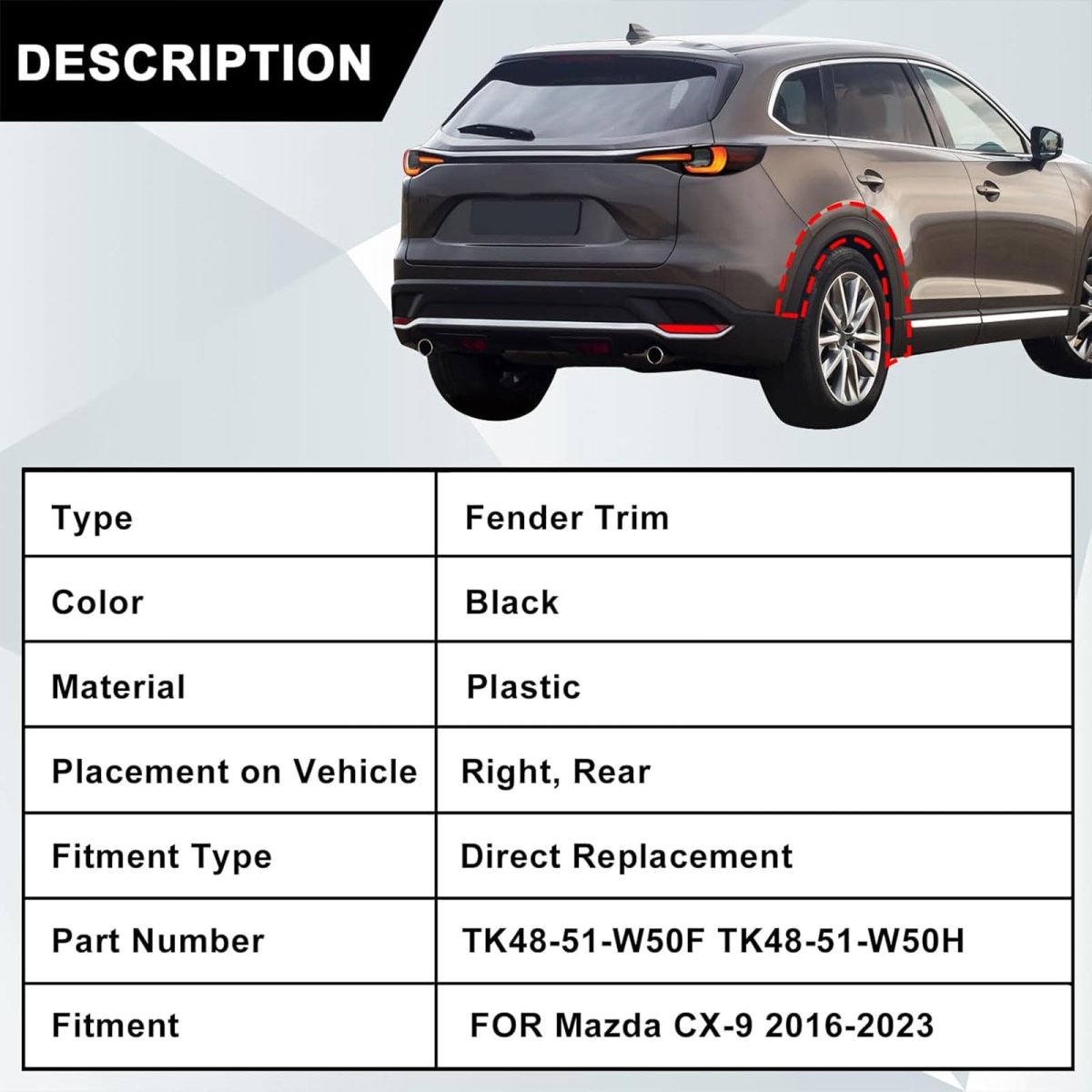 Fitment: Compatible with Mazda CX-9 2016 2017 2018 2019 2020 2021 2022 2023, Rear Right Side Fender Flare Wheel Molding Trim. Manufacturer Part Number: TK48-51-W50F, TK48-51-W50H, TK4851W50F, TK4851W50H, For 2.5L 2488CC 152Cu. In. l4 GAS DOHC Turbocharged Engine Models.Other fine products