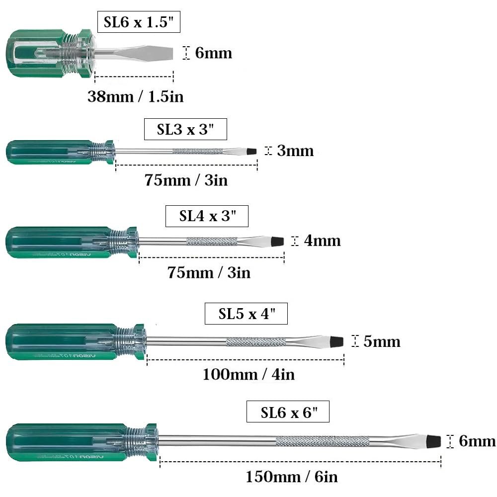 Versatile Flat Screwdriver SetThis precision set contains the most commonly used 5 Slotted Screwdrivers: SL6*1.5", SL3*3", SL4*3", SL5*4", SL6*6". It's designed to effortlessly handle a variety of tasks, from assembling furniture to repairing electronics.. Strong Magnetic TipThe screwdrivers in this set feature strong magnetic tips that securely grip screws and keep magnetization for a long time.. Superior MaterialThe blade is constructed from Chrome-Vanadium Steel for enhanced durability, rust resistant and anti-corrosion.. Non-Slip HandleScrewdriver with ergonomic non-slip handle let you feel comfortable while having maximum control at work.. Wide UsageDesigned for a wide variety of projects and repairs in domestic appliances, furniture, automotive, factory..Other fine products